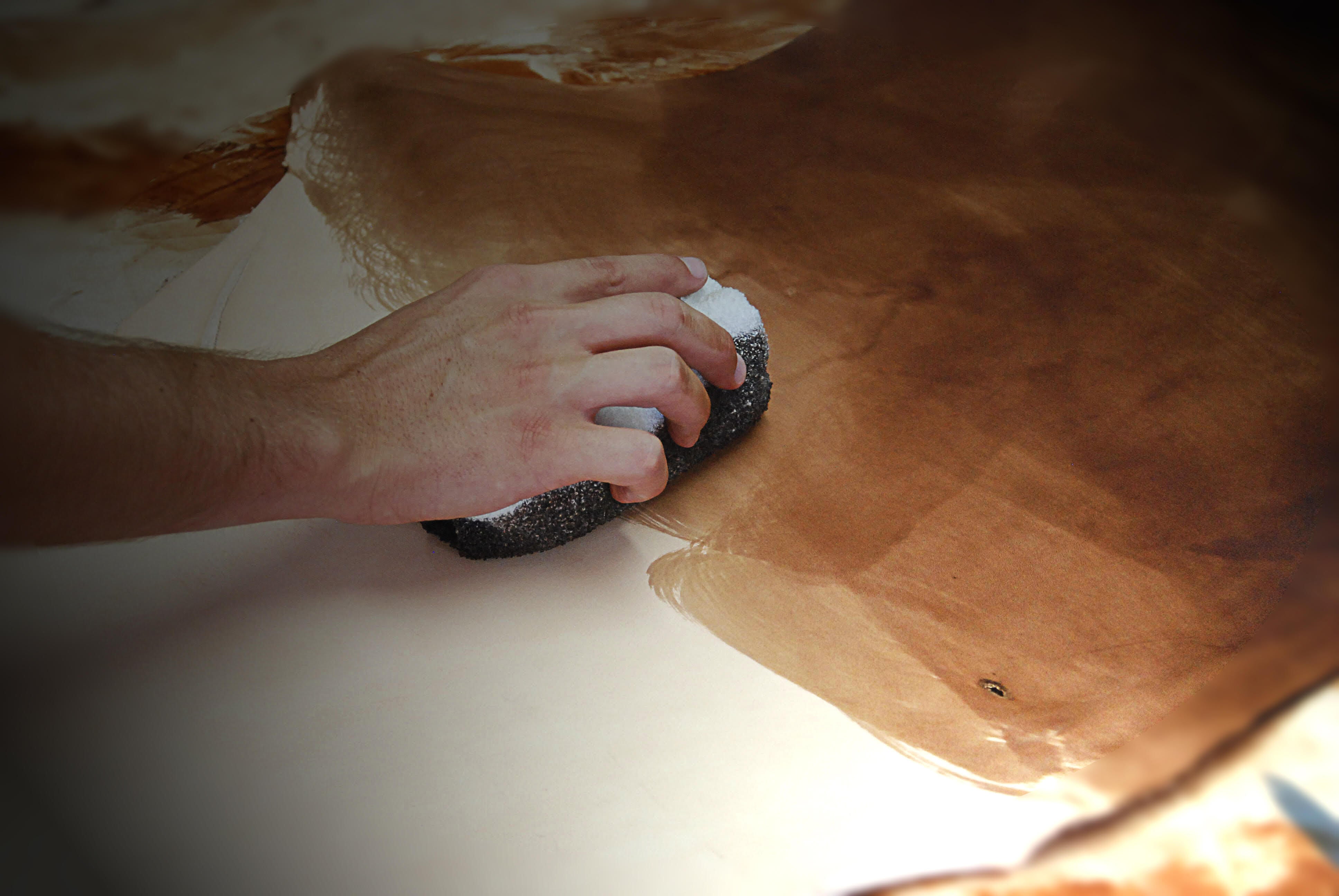 天然のチェスナット(栗)、オーク(ナラ)、ミモザ(アカシア)などのワットルバーグ(樹皮)から抽出された樹液のタンニン(渋)の槽に1枚1枚を漬け込ませます。その期間は実に30日。長い時間をかけて鞣(なめ)されたあとに、染色によって色がつけられます。