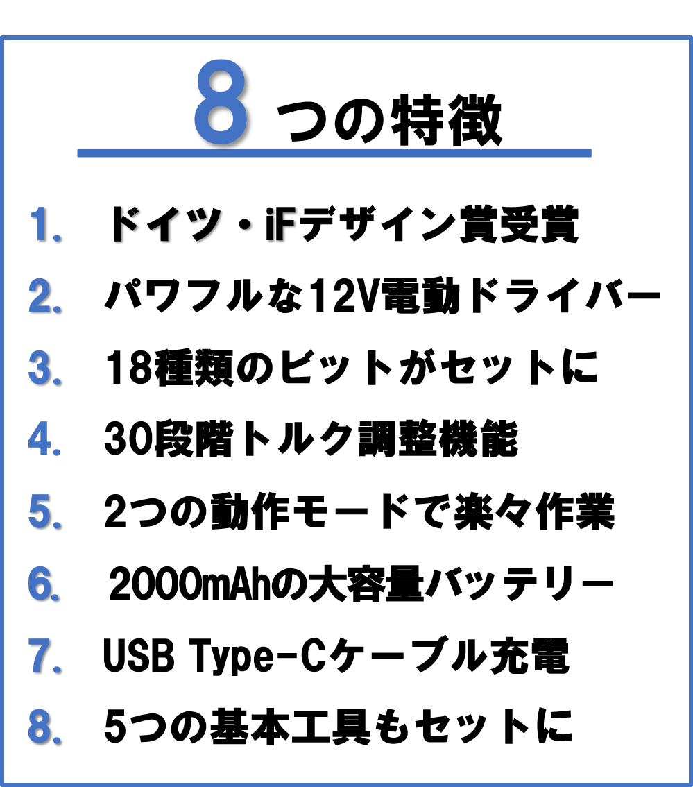 ・8種類の丈夫で錆に強いS2合金製ビットが付属