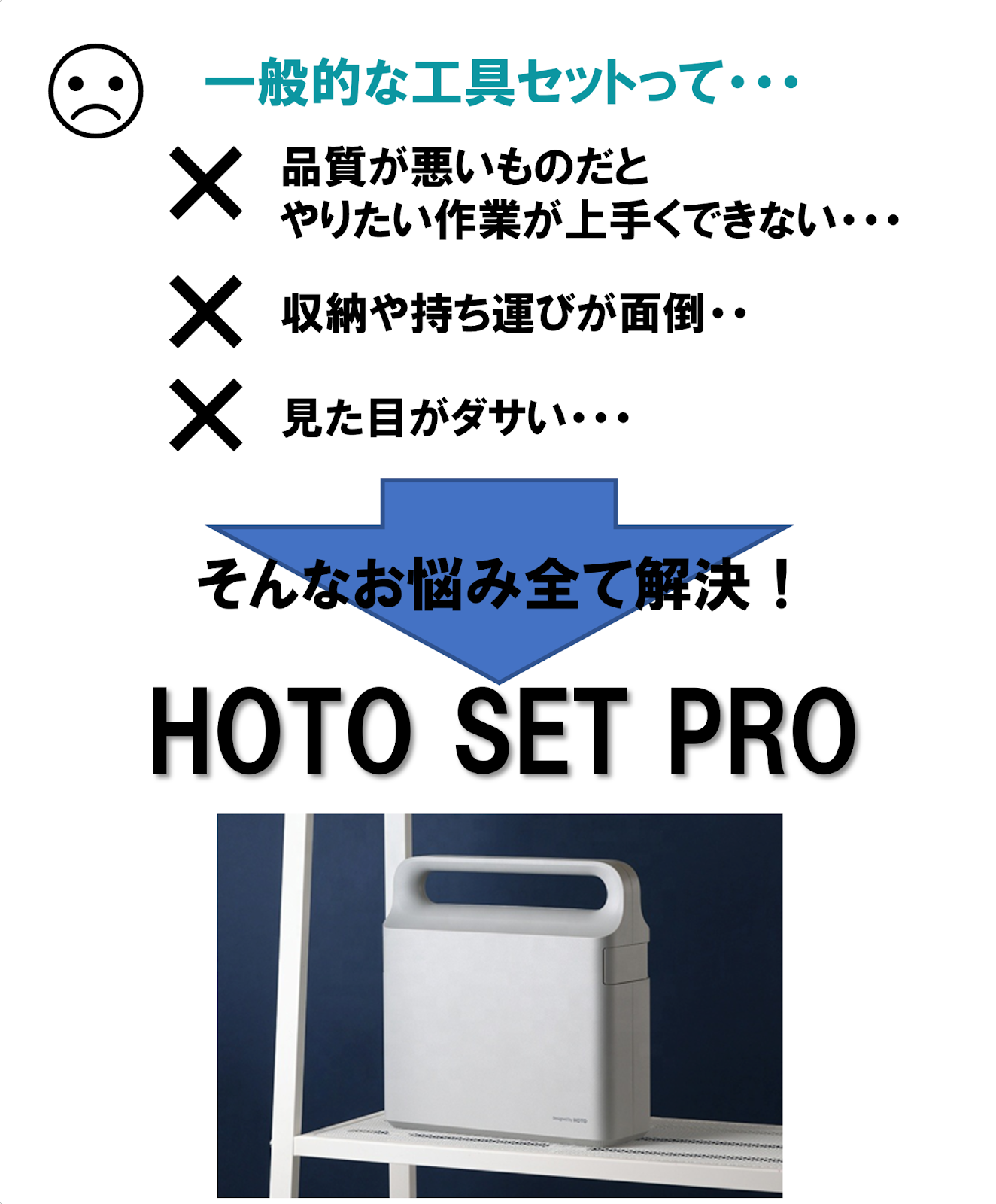 HOTO SET PROは、日常のDIYシーンで最も使用する基本的なツールを揃えた工具セットです。一家に一台あるだけで、家具の組立や家電の修理等、幅広いDIYに対応可能です。