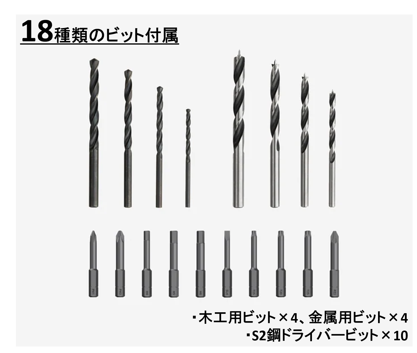 “HOTO SET PRO” には18種類のビットが付属しているため、穴あけとネジ締めといった様々なシーンに対応可能です。