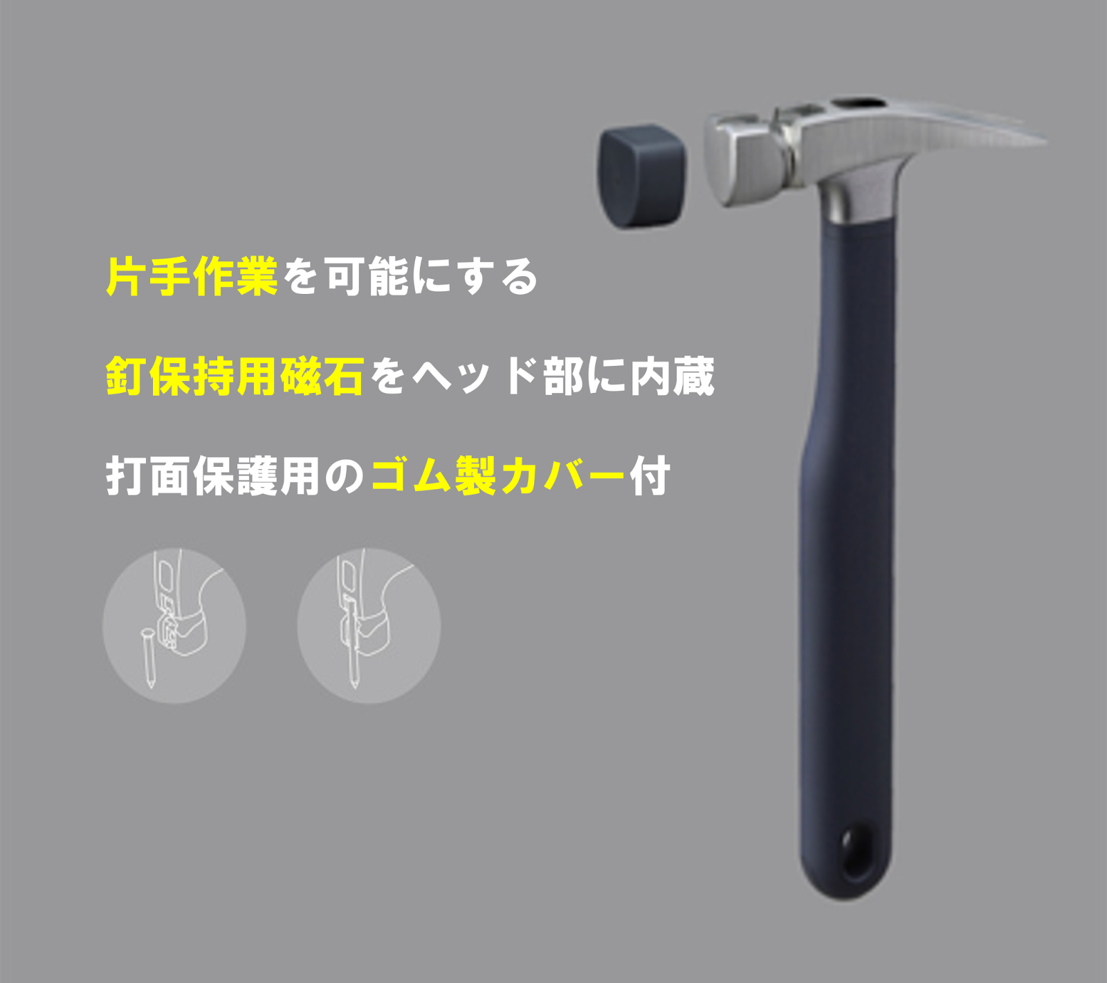 HOTO ネイルハンマーにはヘッド先端に釘を収められるスペースがあり、内蔵の磁石で釘を固定できるため、片手で簡単に釘打ちが可能です。