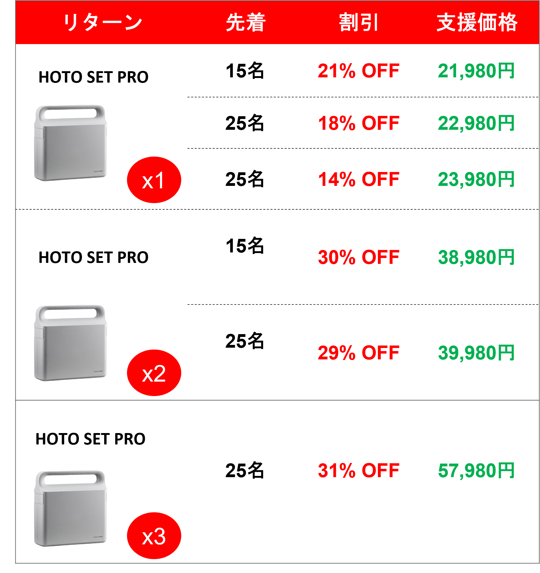 2022/12/16 00:12支援者の皆様、 BRIGHT サポートチームです。お世話になっております。プロジェクト 開始から41日で 34人もの支援者の方々よりご支援を頂き、無事プロジェクト終了を迎えることが出来ました。早速皆様のリターンを2023年01月中にお届けできるよう準備を始めております!皆様にご満足いただけるリターンをお届けできるよう、全力で取り組んで参りますので引き続き、【HOTO SET PRO】 をよろしくお願い致します。BRIGHTサポートチーム もっと見る