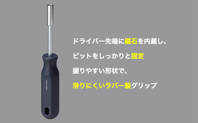 ・ドライバー先端に磁石を内蔵し、ビットをしっかりと固定
