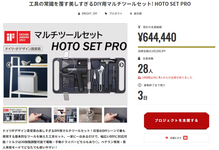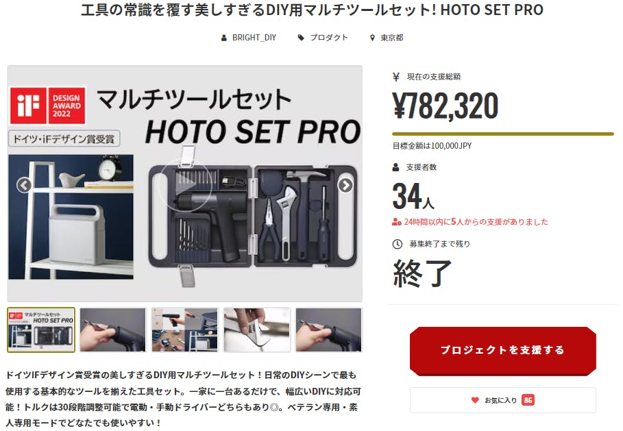 2022/12/12 21:36この度は「DIY用マルチツールセット! HOTO SET PRO」にご支援頂き誠にありがとうございます!皆様のご支援のおかげさまで、60万円の目標金額を644%達成することができました。Brightチームは当プロジェクトをより多くの方へ知って頂きたいと考えております。よかったら、FacebookやTwitter等のSNSでのシェア・拡散をお願い致します。https://camp-fire.jp/projects/view/614950どうぞよろしくお願い致します。Brightチーム もっと見る