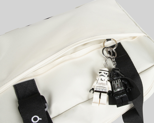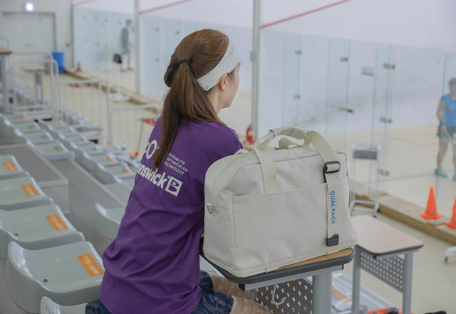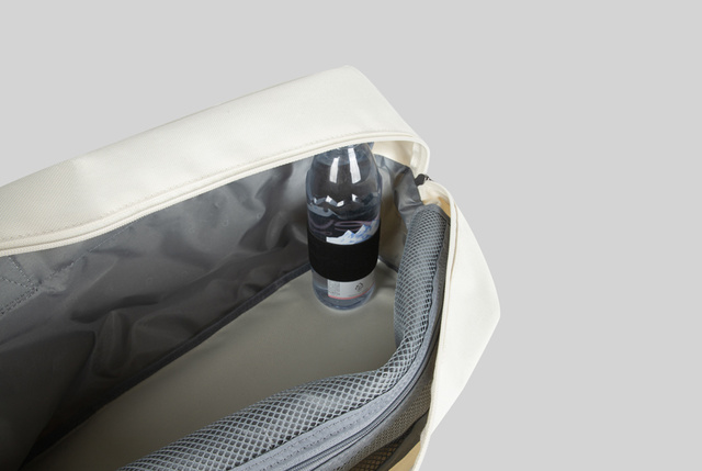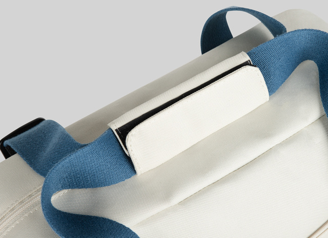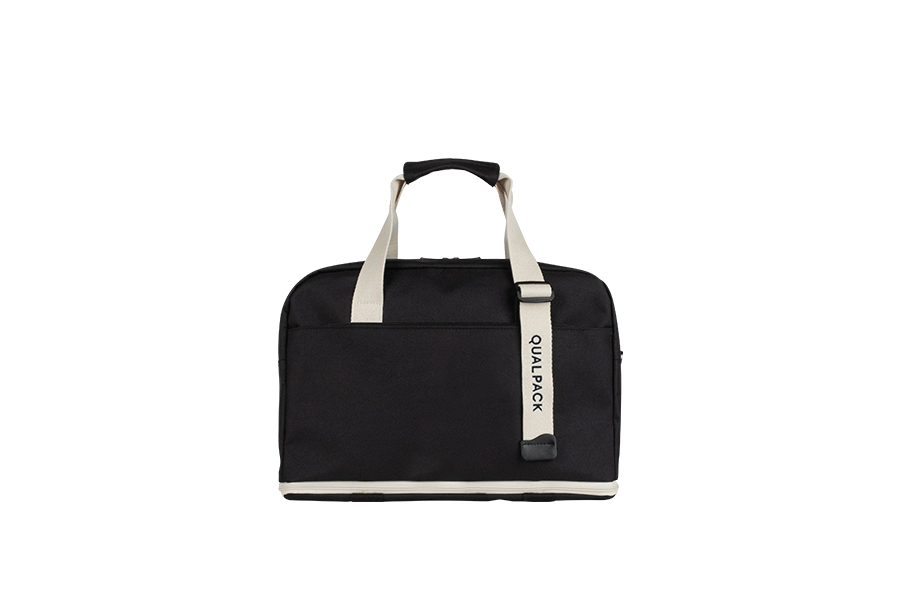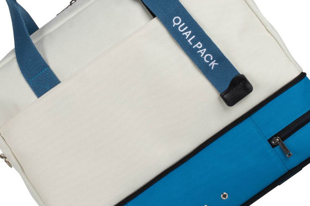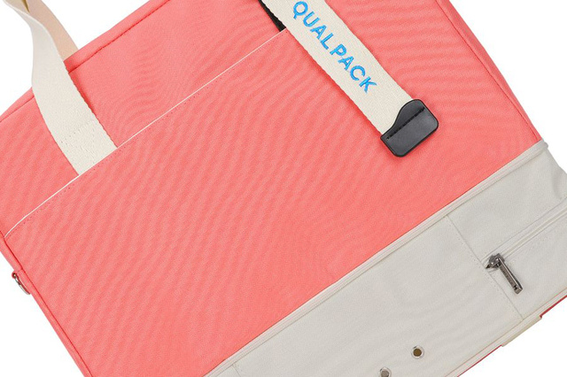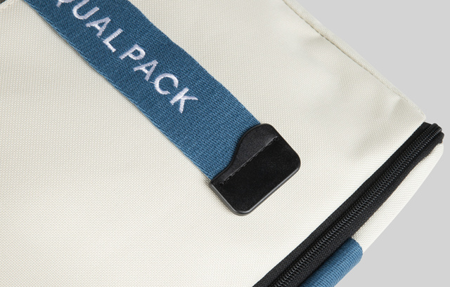 バッグのベースカラーに調和させた持ち手の配色と紐を調整する部分には、「QUALPACK 」ロゴ刺繡を入れました。