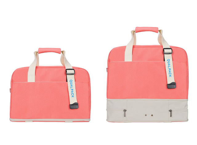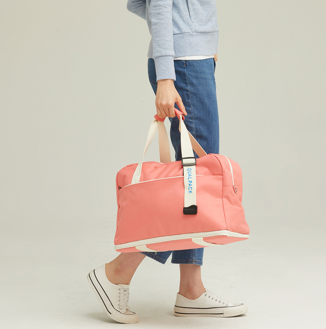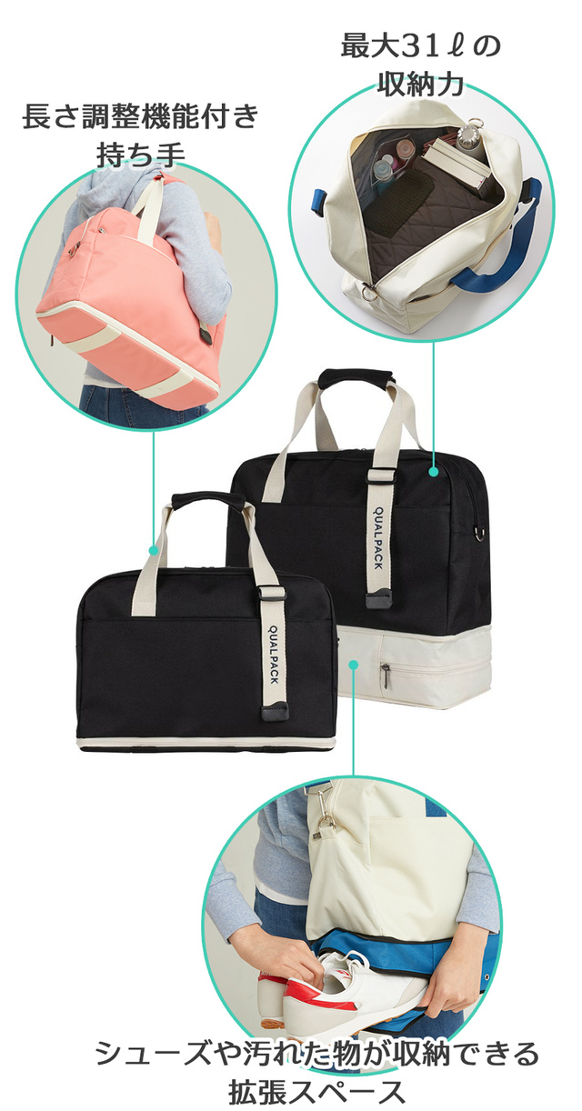 拡張スペースに汚れたものや汗をかいた洋服、運動靴などを入れられスペースを設けている優れた使い勝手。持ち手の長さも調整することができるので、ショルダーバッグとしてもお使いいただけます。カラーバリエーションも色と豊富で使い勝手も優れた「QUALPACKストレッチバッグ」をご紹介いたします。