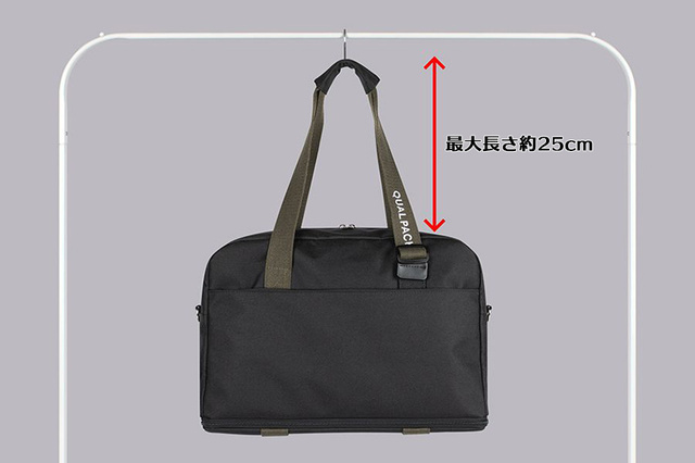 「QUALPACK PACKストレッチバッグ」の持ち手は、長さを調整できます。使う人の体型に合わせたり、長さを伸ばして肩に掛けるショルダーバッグとしても使用可能です。