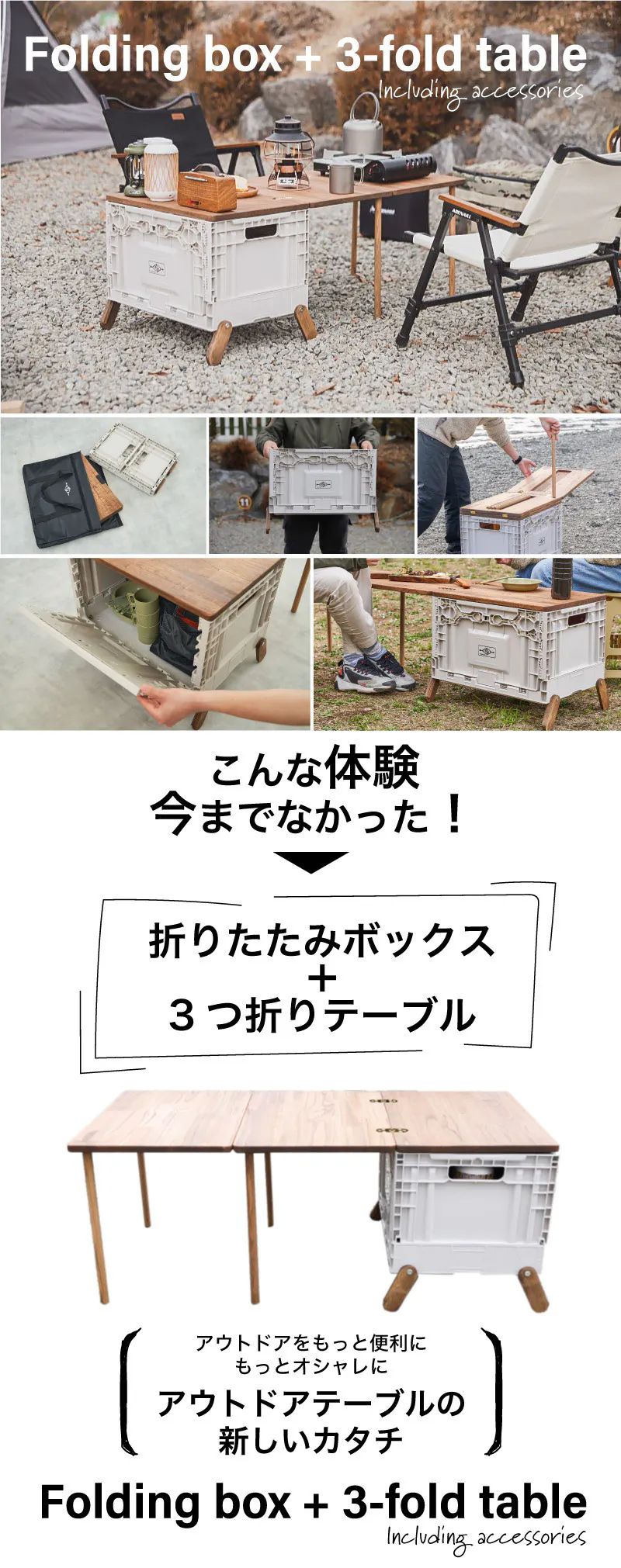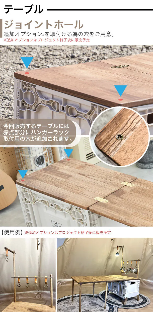 初めて見つけたとき、「こんなの今まで見たことない!テーブル脚が天板に格納されてる!ボックスにも脚が付いててかわいい!使ってみたい!」と1人興奮しました。テネシーキャンピングのキャンプ用品は、折りたたみボックスを使っていろんな可能性が広がるところが魅力的です。そしてテーブルもシェルフもアウトドア用品なのに「インテリア」にもなり得るデザインも然り。屋外で使わないときはインドアでも活用できます。デザインも機能性も妥協したくない、またインテリア好きな方にも喜んでいただける製品だと思います。皆さまのライフスタイルに合わせて楽しんでいただきたいです。