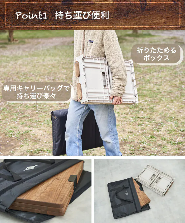 天板部分とボックス部分を別々に持ち運ぶことができます。天板は3つ折りとなり、専用のキャリーケースに入れて持ち運べるので、運んでいる途中に開いてしまったりすることはありません。