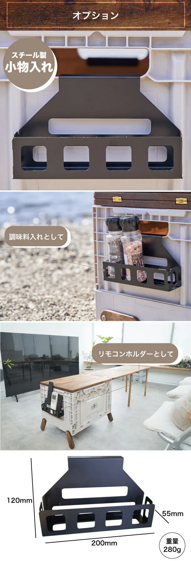 オプション品として、サイドポケット(ブラックスチール製の小物入れ)をご用意しました。ボックスの取手部分や縁の部分、ボックス内側に引っ掛けてお使いください。調味料を入れたり、リモコンを入れたり、ちょっとしたものを入れておくのにピッタリのサイズ感です。ぜひ、ご一緒にお使いいただきたい製品です。