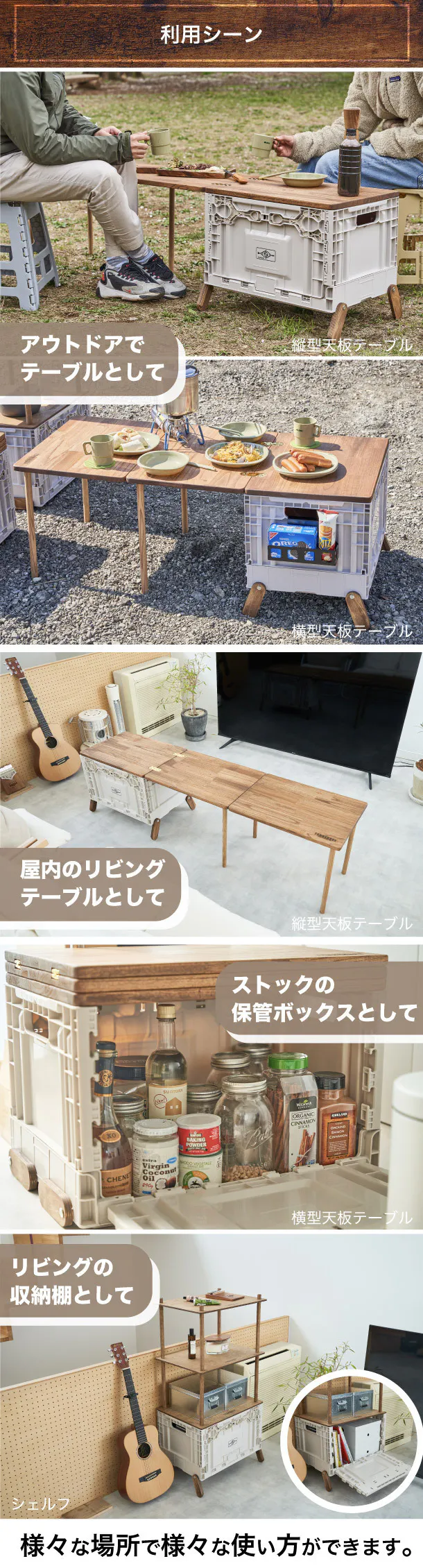 その収納力と利便性は使う場所に制約を持ちません。アウトドアでもインドアでもその能力を十分に発揮します。アウトドアでは広いテーブルとして、ゆとりのあるキャンプが行えます。