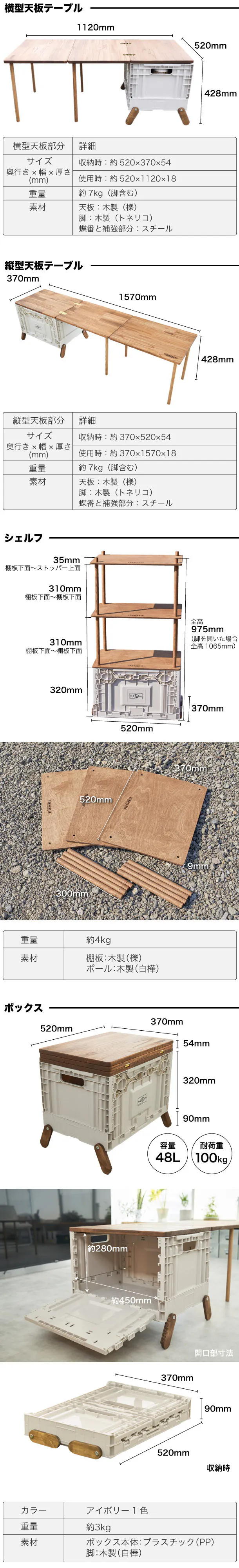 横型天板テーブルと縦型天板テーブル、シェルフの3つからお選びいただけます。テーブルは奥行きを確保した横型と長さを確保した縦型。どちらも使い勝手が良くなるよう設計されています。シェルフは3段となっており、アウトドアにおいて便利な棚としてご利用いただけます。あなたのお好みはどちらですか?