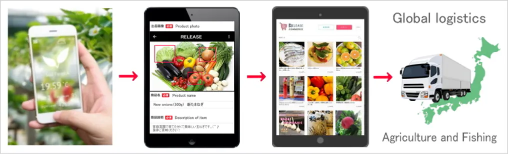 農家さんや漁師さんは、自分が大切に育てた野菜や果物、魚介類などの写真を撮るだけで、それが簡単にオンラインストアで出品、販売されることを想像してみてください。