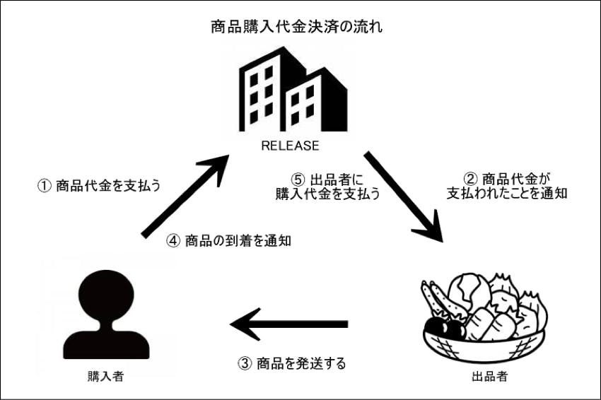 私たちは独自の決済方法「エスクロー(代金と商品の安全な交換プログラム)」を完成させ、Releaseコマース「食のオンラインマーケット」プラットフォームにてサービスの利用を開始しています。(現在は日本のみ)