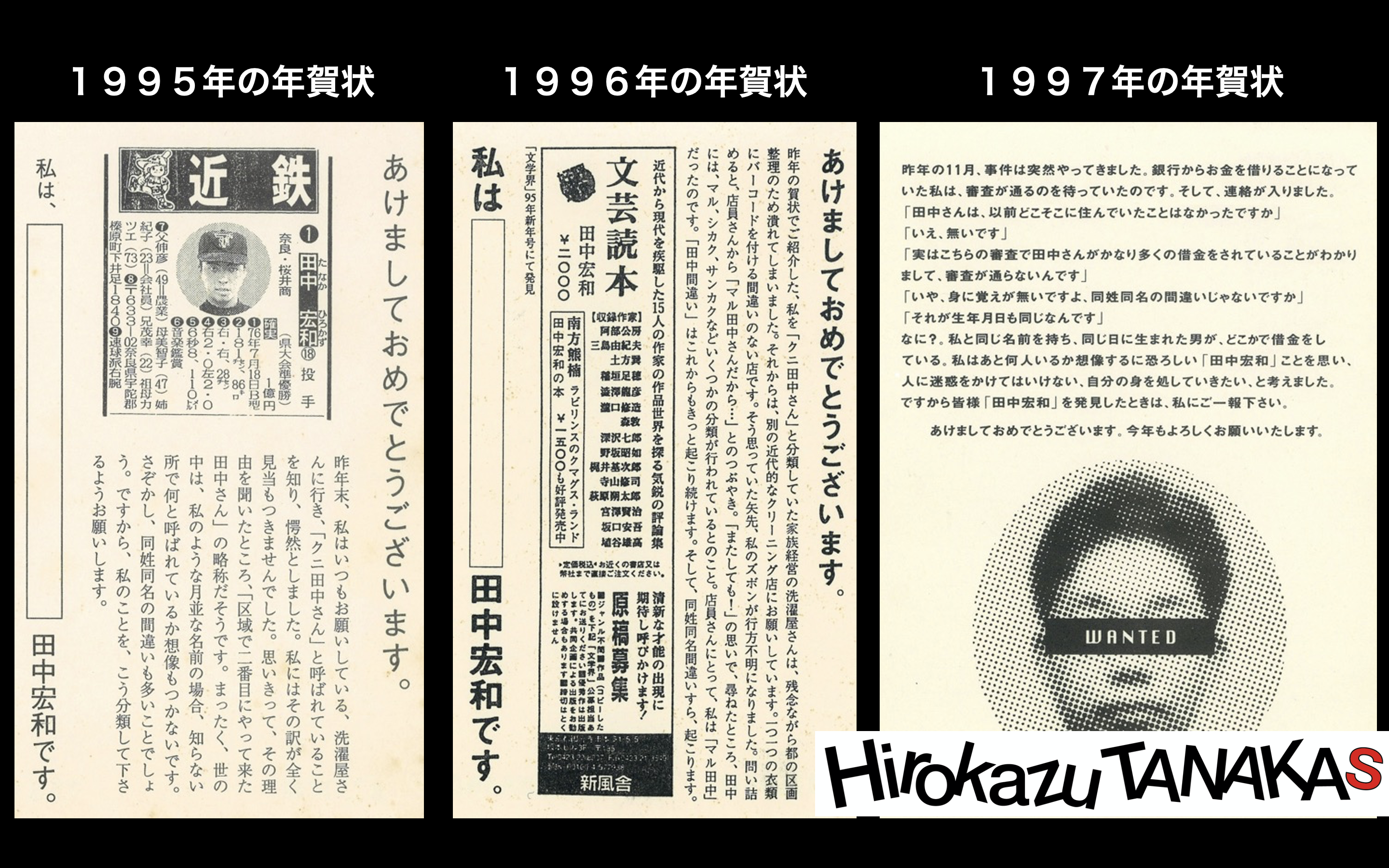 翌年には雑誌『文學界』の書籍広告で南方熊楠の研究書を出版している田中宏和さんを見つけました。プロ野球のドラ1の田中宏和さんから、専門書の著者になっている田中宏和さんまで、その幅の広さが凄いなと感じました。以来、毎年一人は新しい田中宏和さんの情報をゲットし、その発見を翌年の年賀状のネタにするということが続いていました。自分の実体験としても、銀行で自動車ローンを申請して、同姓同名で同じ生年月日の別の田中宏和さんのために審査が一発で降りなかったこともありました。