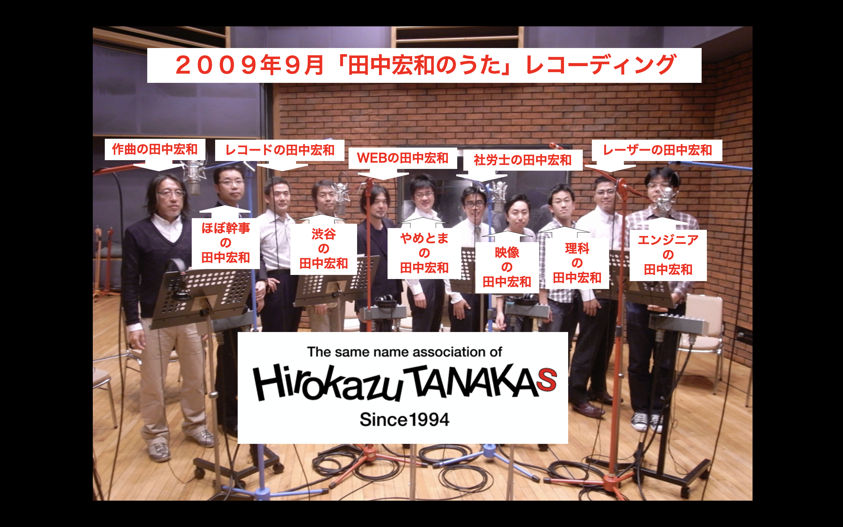 2009年、7人の田中宏和集会の1週間前にTBSの『新知識階級クマグス』という番組から取材依頼がありました。V6が司会の「南方熊楠の遺志を継ぎ、ひとつの分野を極めるために人生の全てを捧げる研究者」を紹介する深夜のバラエティ番組でした。実際にオンエアになると、Googleの検索急上昇ランキングでトップ10入り、東京中日スポーツや朝日新聞などからの取材申し込みを受けました。 その流れで、田中宏和のテーマソングがあれば良いと思い、2番目にお会いした「作曲の田中宏和さん」に相談したところ、「詩があれば曲はつくれますよ」とのこと。夜中に突然降りてきた歌詞をお送りし、「幼い田中宏和ちゃんから、おじいちゃんの田中宏和さんまで歌える校歌のような曲をお願いします」と依頼したところ生まれたオリジナルソングが、『田中宏和のうた』。11人の田中宏和さんで歌い、製作費を分担し、全員で原盤権を共有することにしました。