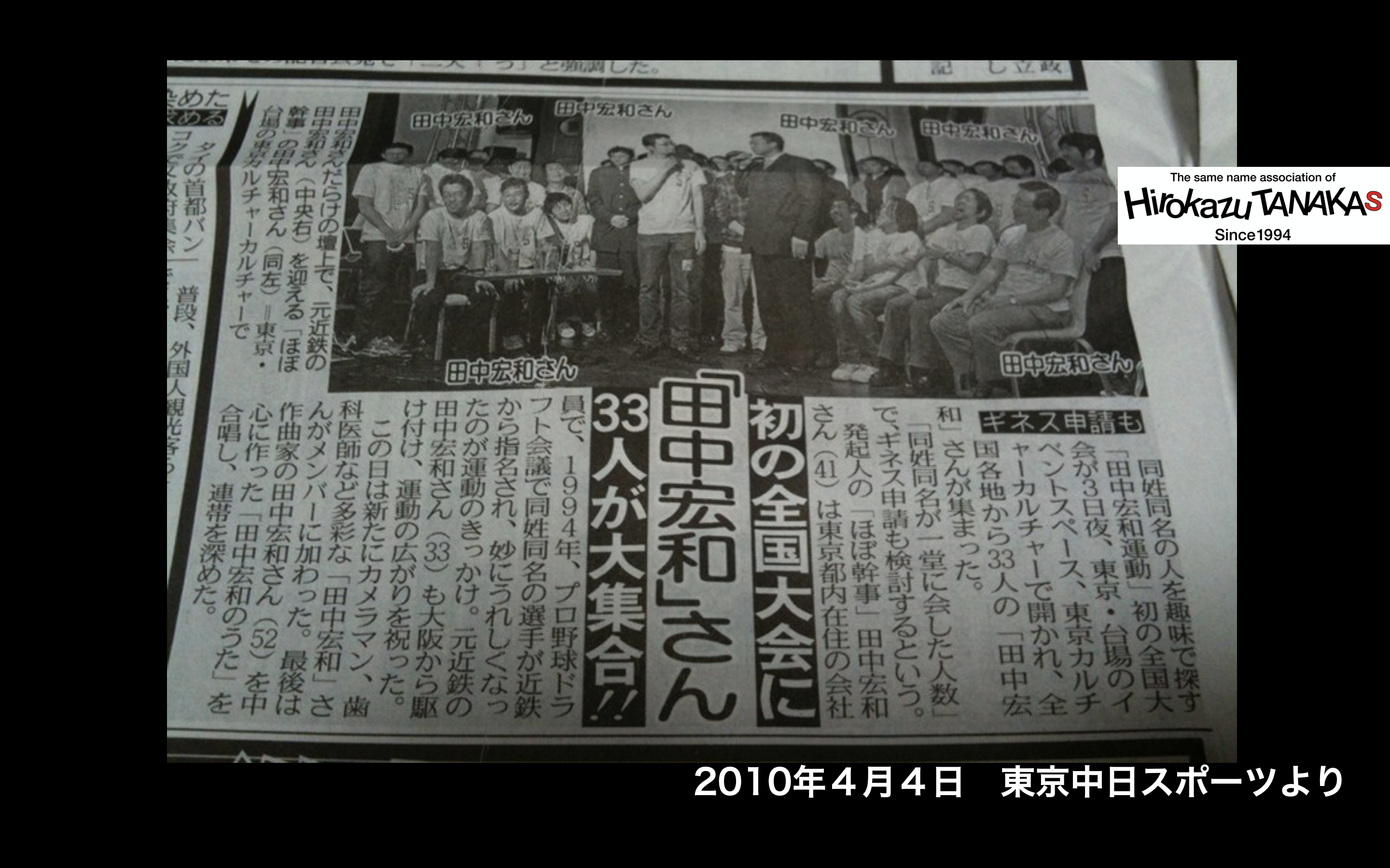 さらに当時はお台場の東京カルチャーカルチャーというイベントスペースの横山シンスケ店長から「田中宏和の同姓同名イベントをしませんか」とのお誘いを受けました。そんなものが成立するのだろうかと半信半疑で引き受け、「田中宏和運動全国大会2010」を開催。蓋を開けてみれば、33人の田中宏和さんが全国から集まり、田中宏和さん以外のお客さんも来場、メディアの取材も入るイベントとなりました。週明けの朝の情報番組で、みのもんたさんがイベントを紹介する新聞記事にツッコミを入れてました。この結果を受け、横山店長からの「これはギネス記録になるんじゃないですか?」との建設的なご意見を真に受け、ロンドンのギネスワールドレコーズの本部に照会しましたところ、「これまでに無い記録カテゴリーなので、同姓同名の集まりを新設して、最低50名以上集まったらギネス世界記録認定しましょう」という返事を受け取ったのです。