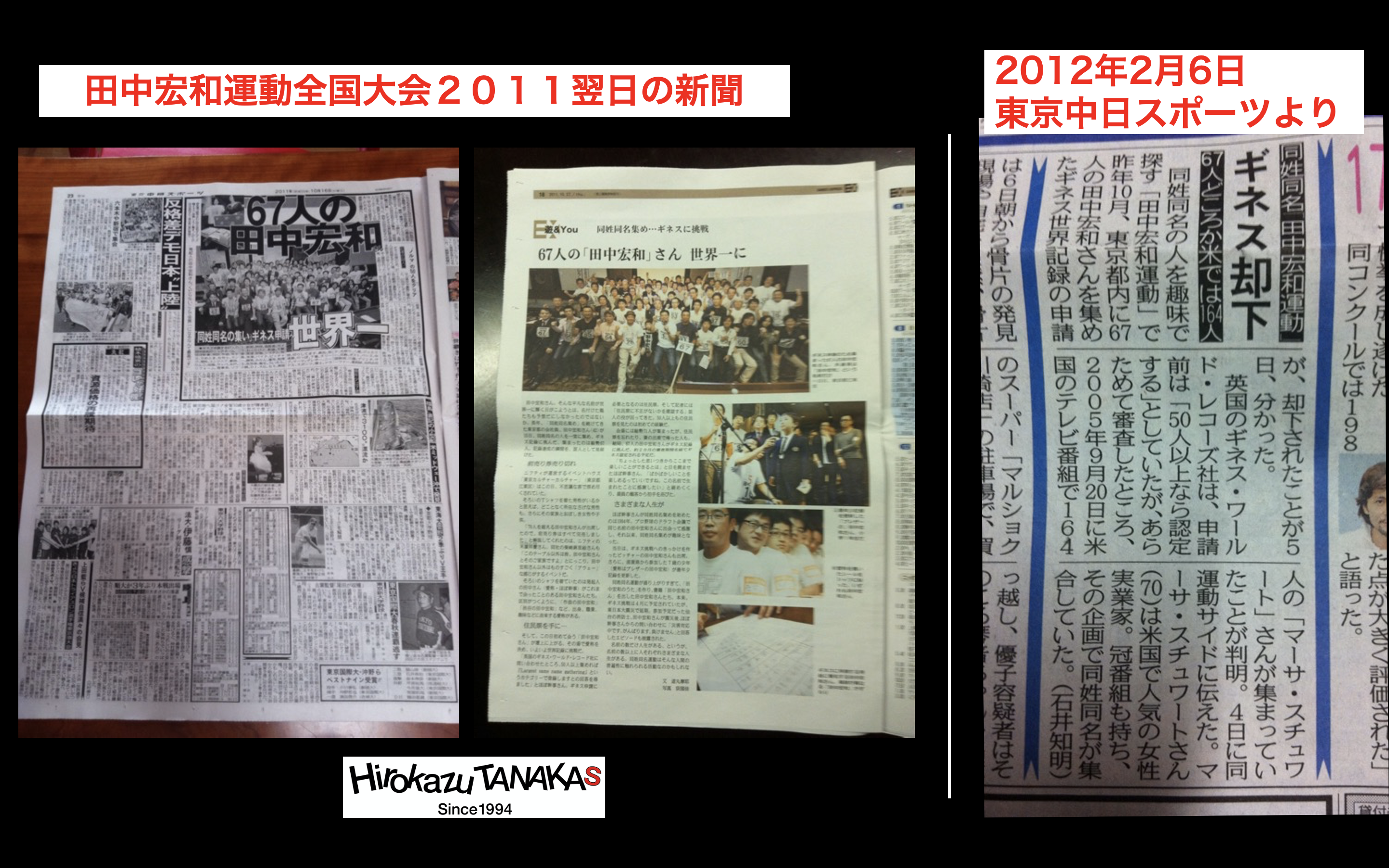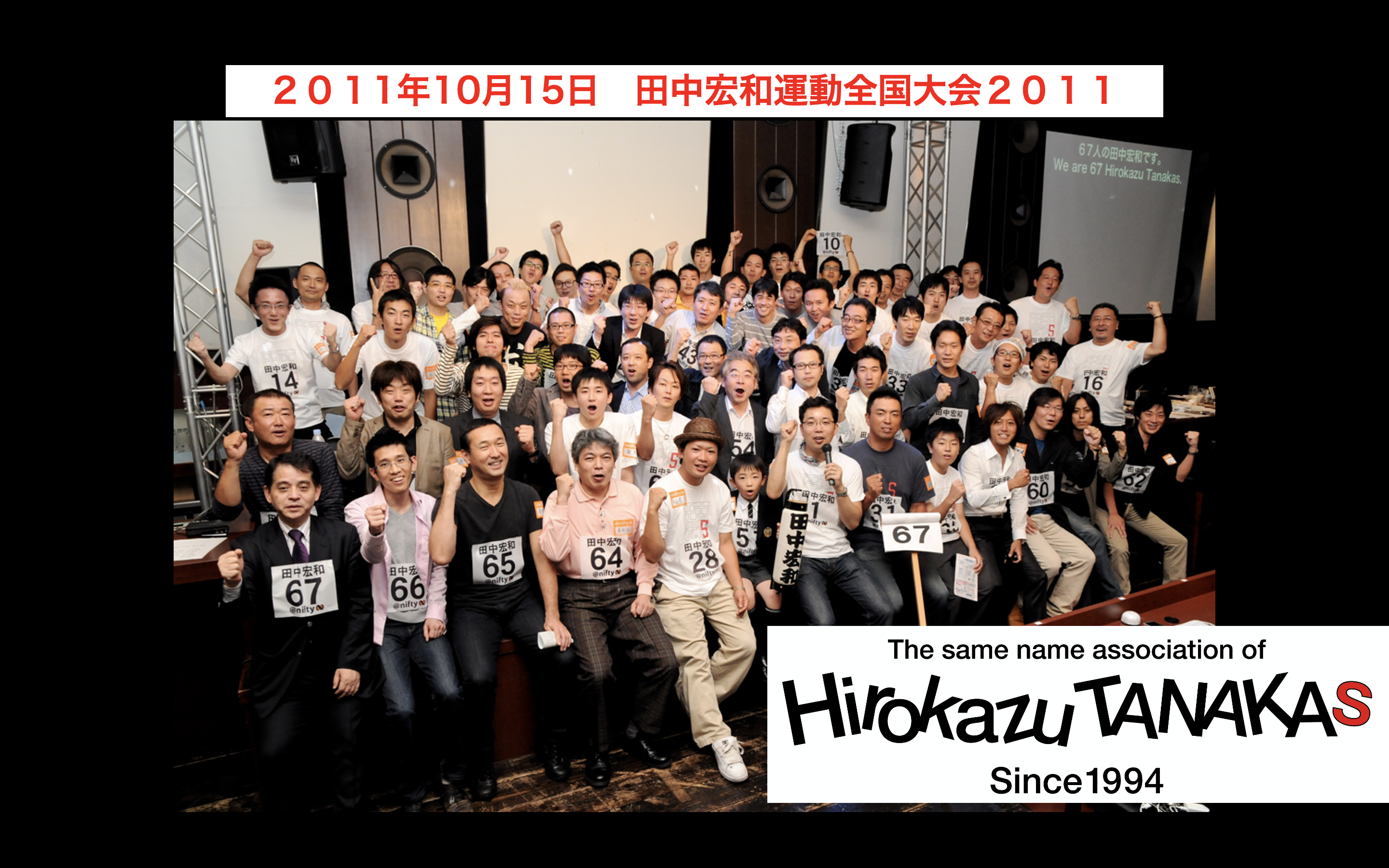 翌年、田中宏和運動全国大会2011には71名の田中宏和さんが東京カルチャーカルチャーに集まりました。記録認定のカウント時に二人が早退、二人が氏名の証明書を忘れ、公式記録としては67名の同姓同名の集いとして記録申請しました。翌日の新聞紙面や週明けのテレビのワイドショーでは「世界一」と大きく報じられたにも関わらず、ギネス本部から「正式審査の結果、2005年にアメリカのカリスマ主婦にして実業家のマーサ・スチュワートさんがNBCテレビの『Martha』という自身がMCをつとめる番組収録で164人のマーサ・スチュワートが集まった記録が見つかったため、今回の申請は却下となりました」とのメールを受信しました。この文面を読んだ時の激しい落胆はいまだにはっきり覚えています。がっかりし過ぎたものの、「だったら164人以上の田中宏和さんで集まれば良いのだな」と気持ちを切り替えました。