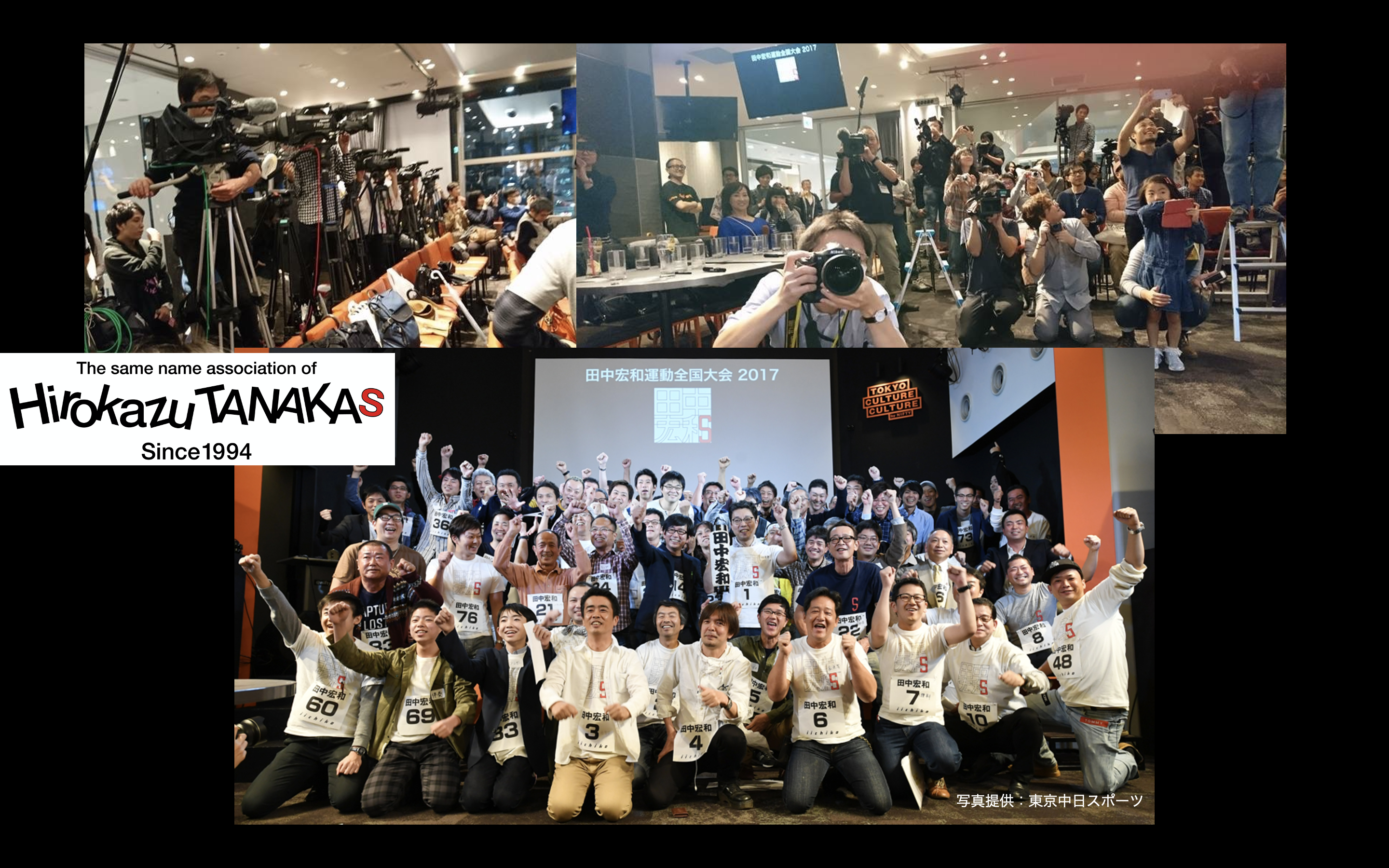 2012年には大阪、福岡、名古屋にて田中宏和運動関西地区大会、九州地区大会、中部地区大会を開催。 2014年には一般社団法人「田中宏和の会」を設立して記録挑戦に備えました。 2017年には生まれたばかりの田中宏和さんのお父さんから連絡をいただきました。山口県山口市の117人目の「ひろくんの田中宏和さん」です。産まれたばかりの田中宏和くんを抱っこし、将来にわたってこの名前が続いていくことを実感し、我が子の誕生のようにうれしい気持ちになりました。そして、5年ぶりの田中宏和運動全国大会2017で2度目の世界記録挑戦を渋谷に移転した東京カルチャーカルチャーで実施しました。100人は超えるかと予測していたのですが、直前に台風の影響を受けたこともあり、結果的には87人の田中宏和さんの集いとなりました。しかし、直前からテレビ、新聞、デジタルのメディアの取材が入り、当日はスポーツ選手でも政治家でも無いのに囲み取材を受け、イベント実施直後には共同通信と朝日新聞のニュース速報になりYahoo!トピックスで写真付きのトップにまでなりました。週明けの朝の情報番組では各局が報道。英字新聞や韓国の東亜日報の記事にまでなり、テレビ東京以外のNHK、キー局で紹介されました。この時の報道をPRの専門家が広告金額換算で試算してくれたら、11億4千万円とのことでした。