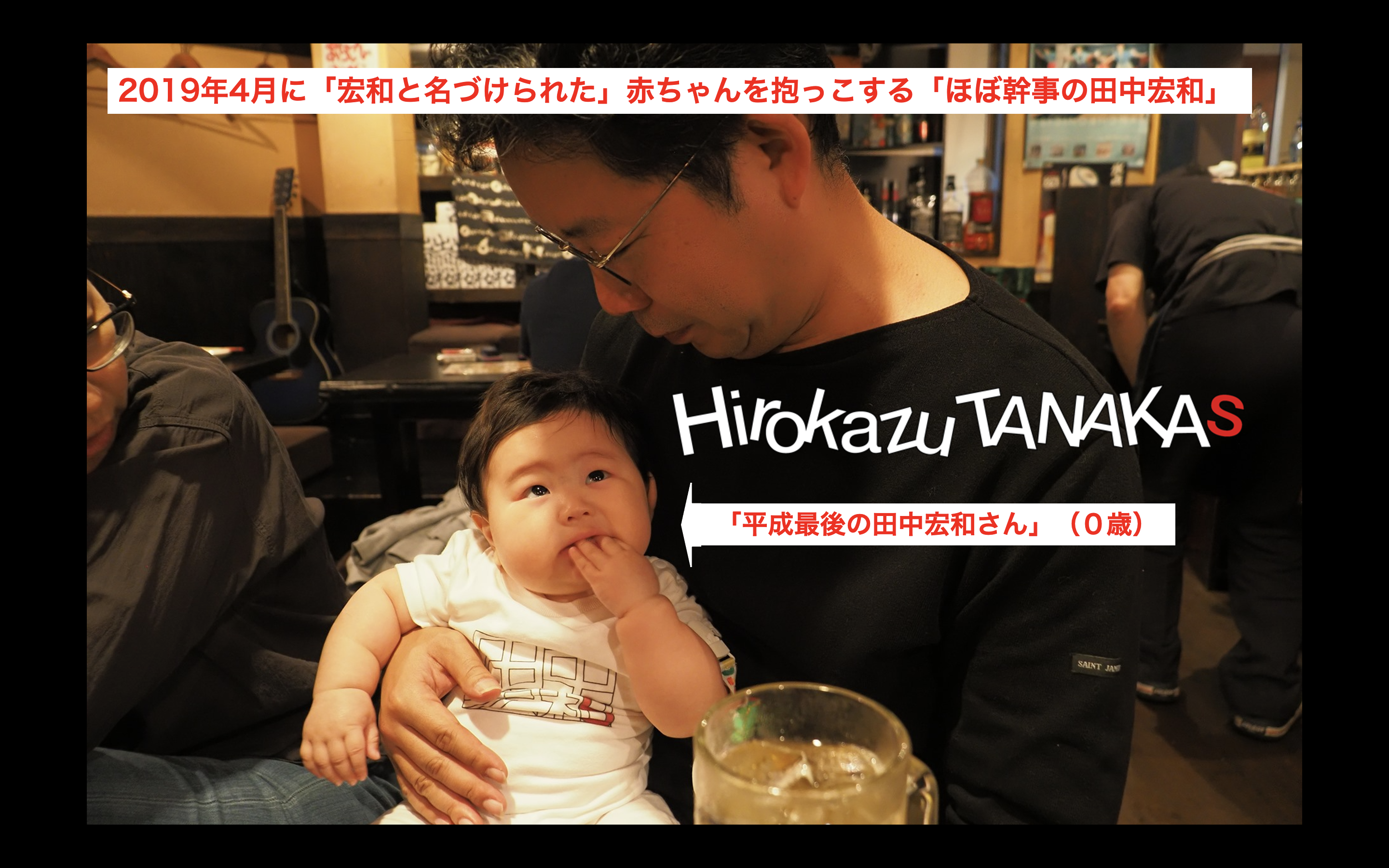 「田中宏和運動」あらため「タナカヒロカズ運動」の発起人、「ほぼ幹事の田中宏和」と申します。一般社団法人「田中宏和の会」の代表理事を務めています。これまで182人のタナカヒロカズさんとお会いしてきました。生まれ与えられた「名前が同じ」というだけの、自分では選べない不思議な人との縁の面白さに取りつかれ、1994年からこの活動を続けています。 まさかこんなに続くとは予想だにしなかった展開に自分自身驚いていますが、おかげさまで様々なメディアで紹介され、同姓同名のつながりが広がってきました。今年3月もテレビ朝日『激レアさんを連れてきた。』で若林正恭研究員(オードリー)から「田中宏和の中心で田中宏和を叫んでいる人」とのラベリングをしてくださり、出演者全員から応援の言葉をいただきました。 今年の5月には日本経済新聞の紙面で「社会実験」として記事になりました。(参考:ウィキペディア「田中宏和運動」)