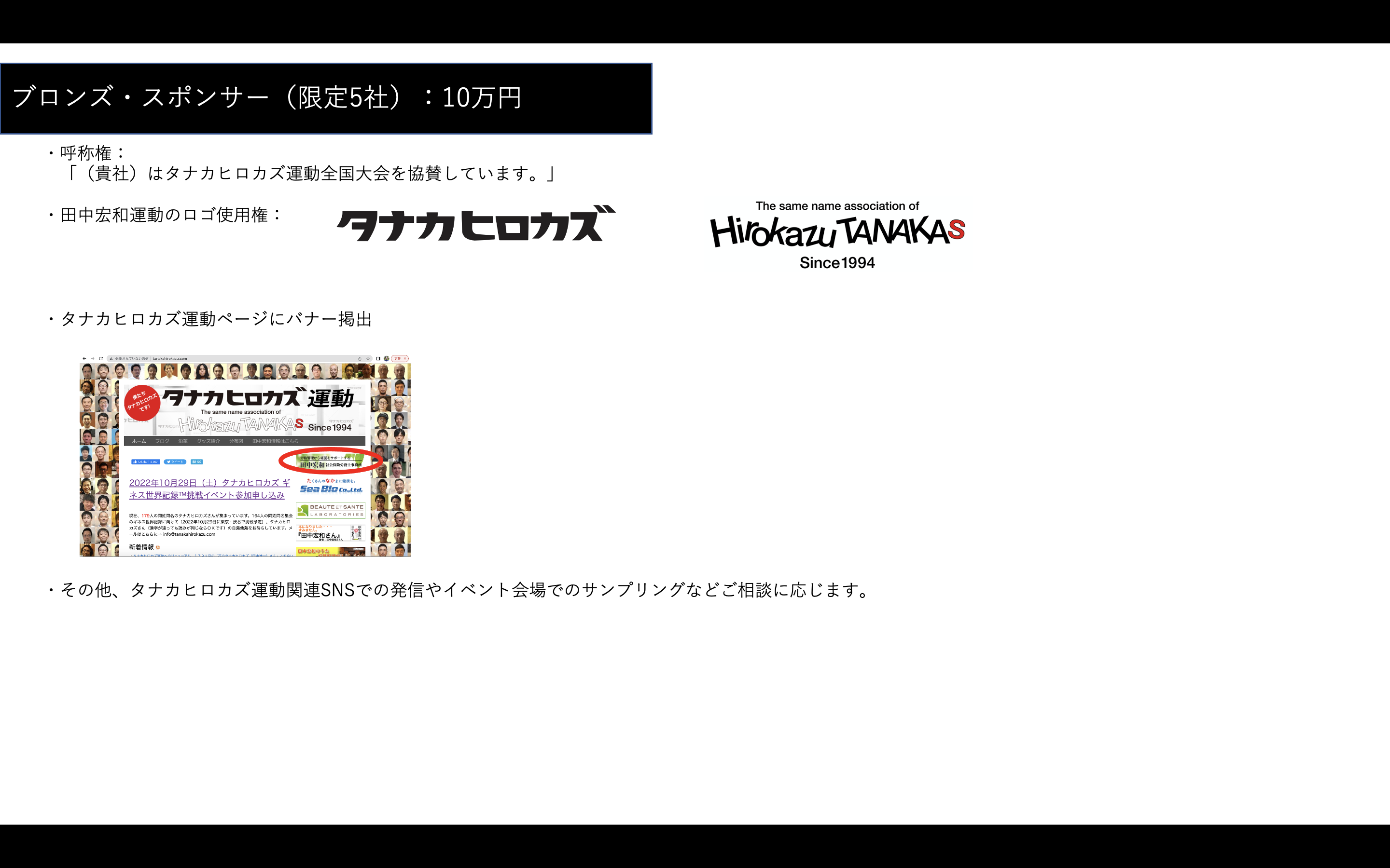 ・ブロンズ・スポンサーになる(呼称権、ロゴ使用権、びタナカヒロカズ運動ページのバナー等への企業名・ロゴ掲載/最大5社想定) 10万円
