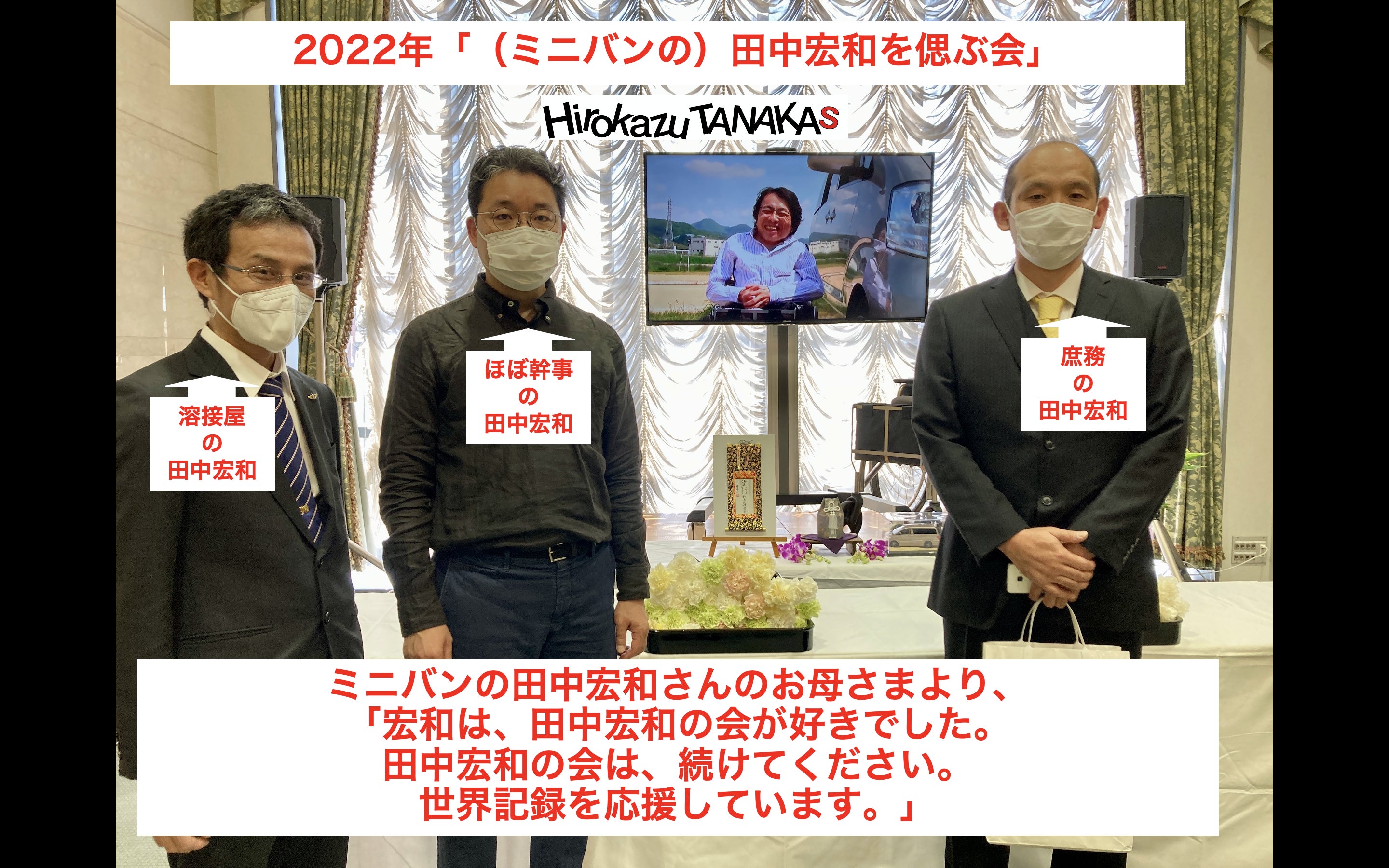 昨年の4月、2012年に田中宏和運動関西地区大会でお会いした車椅子で生活をされている、86人目の「ミニバンの田中宏和さん」が新型コロナウィルスのため50歳の若さで亡くなったとの知らせを受けました。お母さまにお悔やみのお電話をしましたら「宏和は、田中宏和の会が好きでした。田中宏和の会は、続けてください。世界記録を応援しています。」と、逆に励まされました。