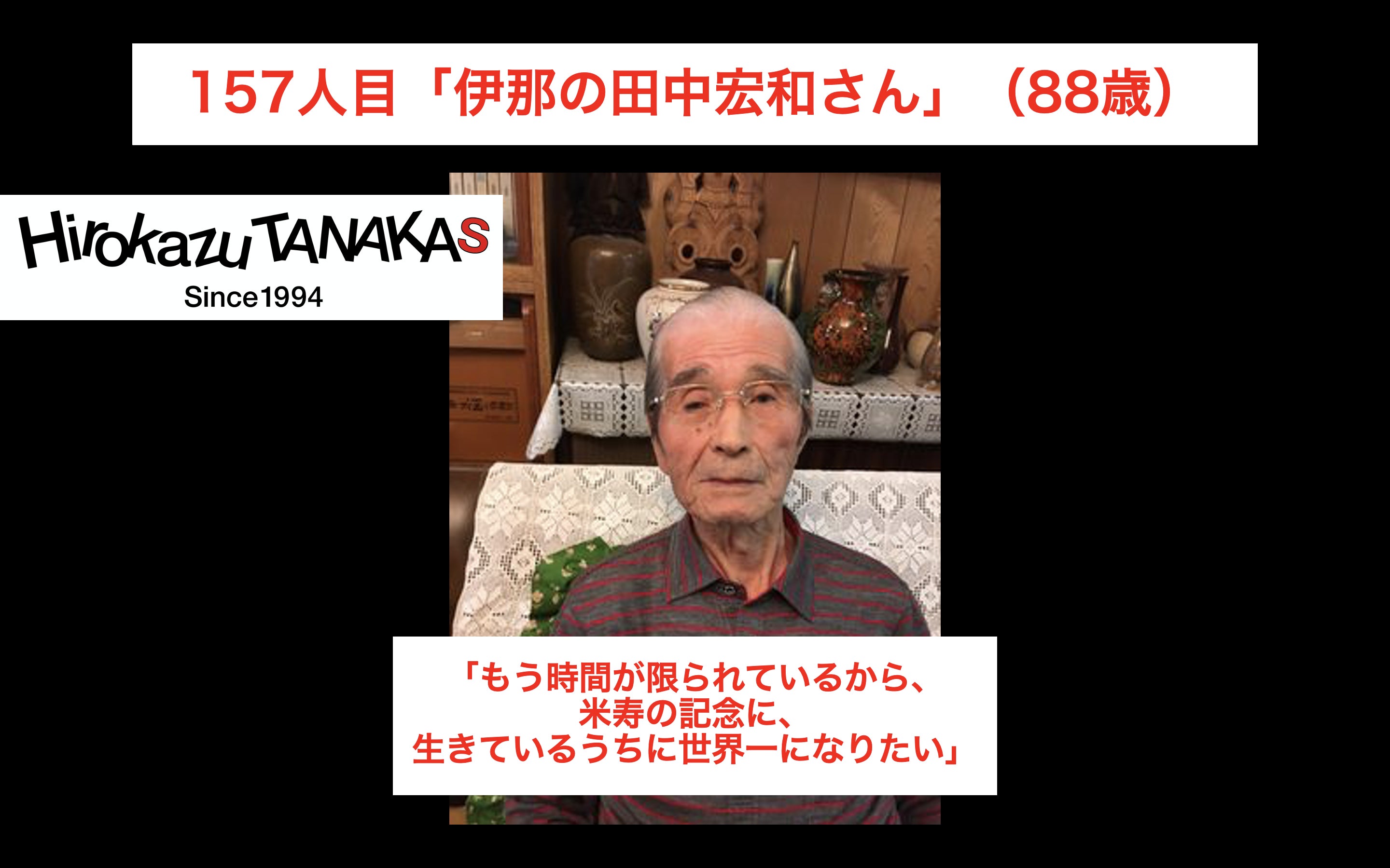 同じく昨年の10月、息子さんご夫婦からのご連絡を受けZoomで初対面した、157人目の「伊那の田中宏和さん」は今年で88歳。「もう時間が限られているから、米寿の記念に、生きているうちに世界一になりたい」と、その重いお言葉を受け止め、2022年での世界記録挑戦を決め、漢字を問わずタナカヒロカズさんたちの集会で確実に記録達成をと思った次第です。