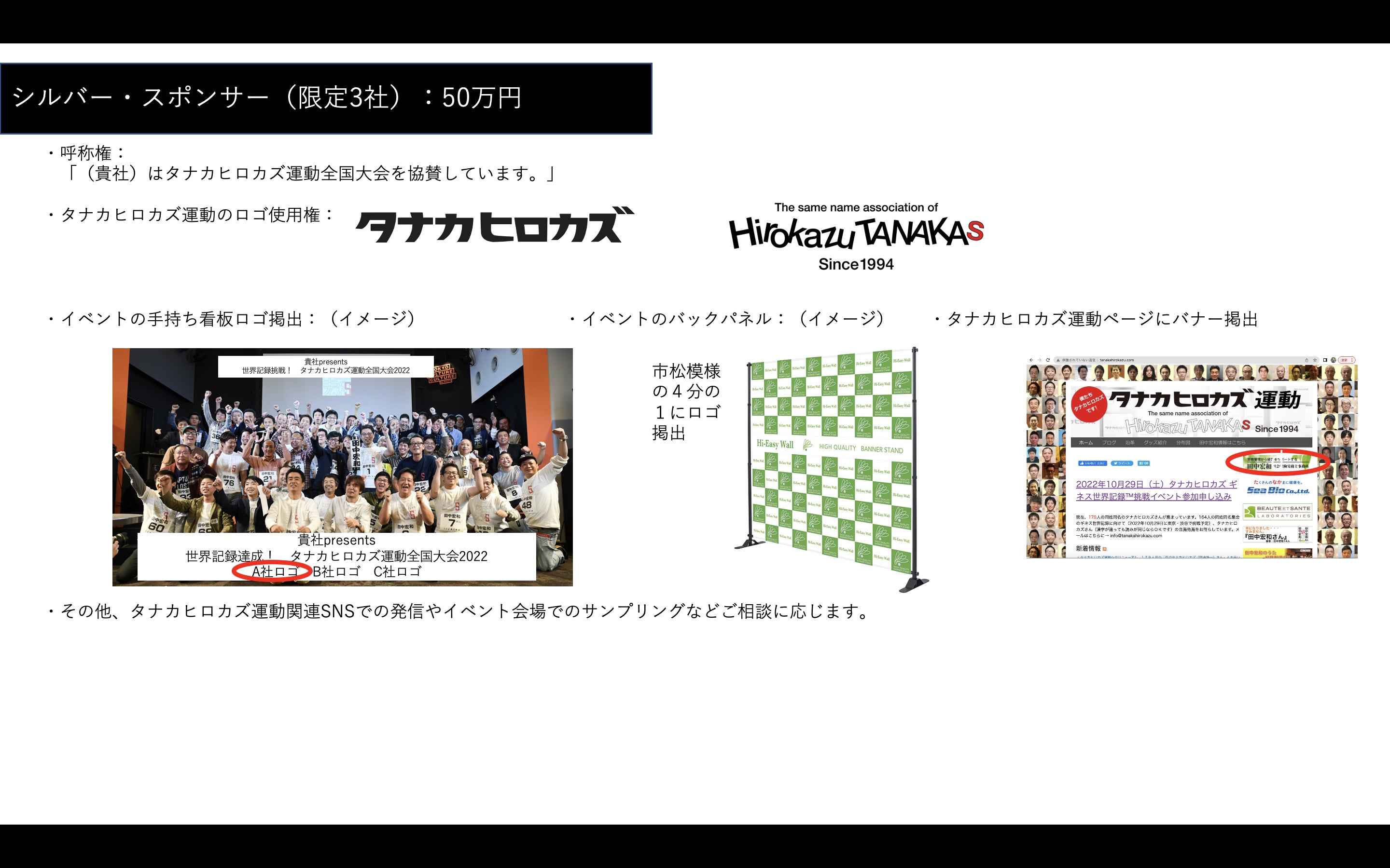 ・シルバー・スポンサーになる(呼称権、ロゴ使用権、手持ち看板およびバックパネルおよびタナカヒロカズ運動ページのバナー等への企業名・ロゴ掲載/最大3社想定) 50万円