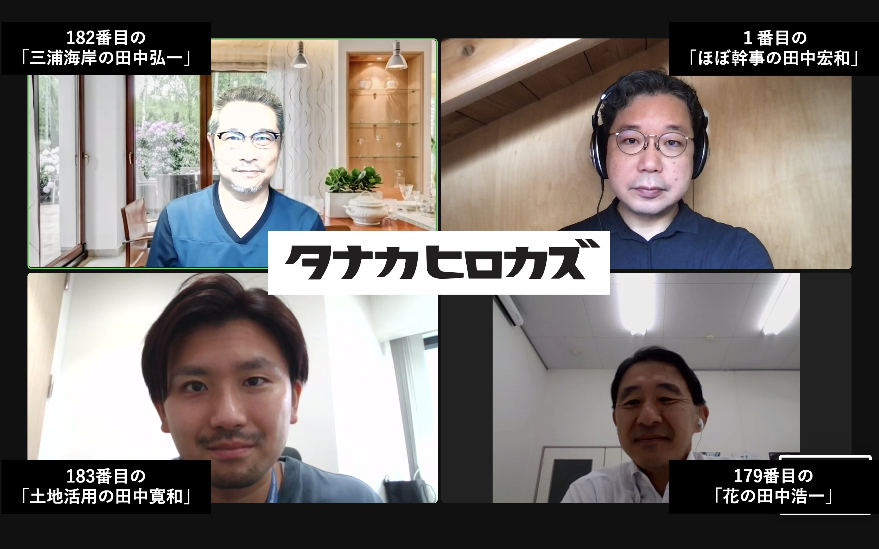 2022年7月には漢字を問わず同姓同名のタナカヒロカズさんとのつながりを広げる「タナカヒロカズ運動」にリニューアル。先日は、179人目の「花の田中浩一さん」の仲介で、182人目の「三浦海岸の田中弘一さん」、183人目の「土地活用の田中寛和さん」とのリモート初対面が実現できました。
