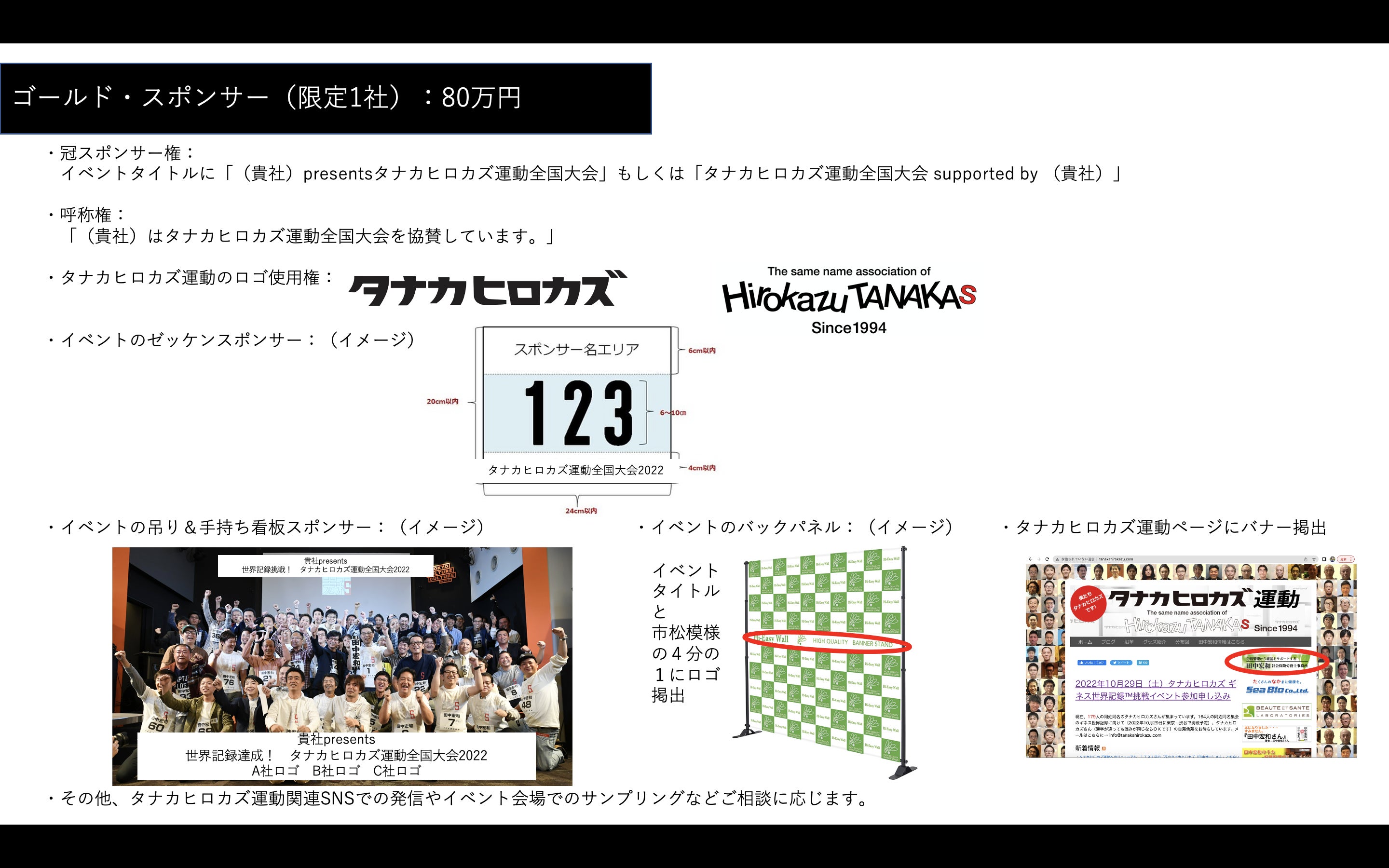 ・ゴールド・スポンサーになる(イベント冠スポンサー権、呼称権、ロゴ使用権、ゼッケンスポンサー、吊り&手持ち看板スポンサー、バックパネルおよびタナカヒロカズ運動ページのバナー等への企業名・ロゴ掲載/1社限定) 80万円