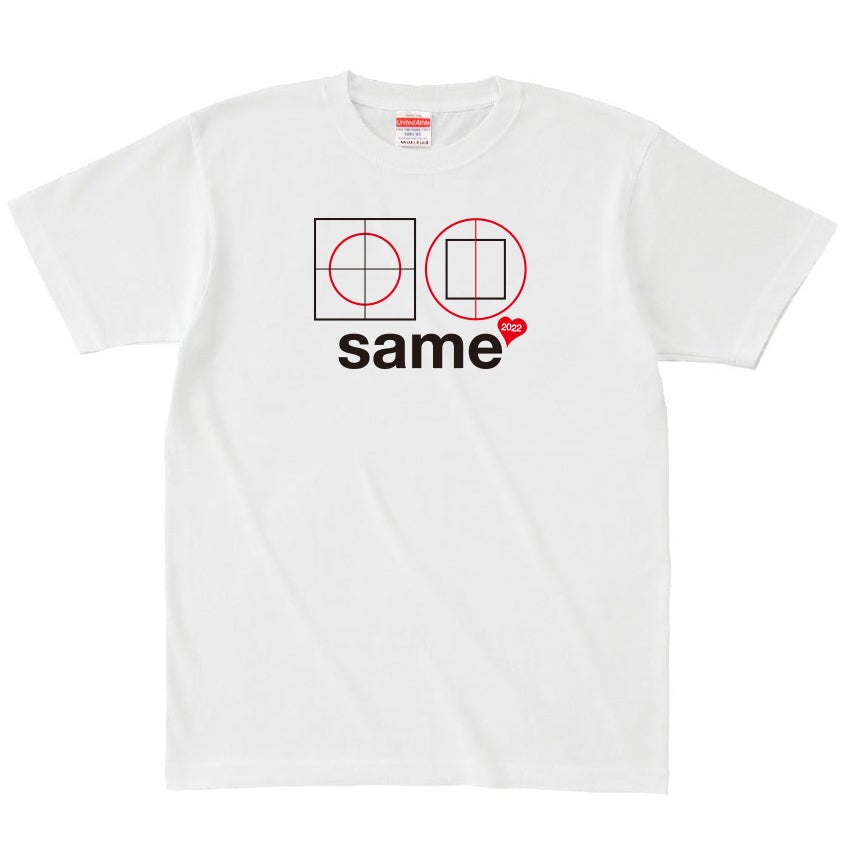 昭和の名コピー「違いがわかる男」が、平成になり「上質を知る人」になったような、差異への感性を磨くことには、なんらケチをつけるつもりはないのですが、昨今のささいな違いを指摘することでマウントを取ろうとする揚げ足取り競争がもたらす、不健全な「分断」に憂慮しています。そんなことで、今回のタナカヒロカズ運動全国大会2022のコンセプト「PEACE by the SAME !」を「渋谷の田中宏和さん」に表現してもらいました。今年ならではの限定感を出すために、あえて「2022」と入れています。○と□と赤と黒の組み合わせの二つの記号が、「だいたい同じ」シンボルになっています。