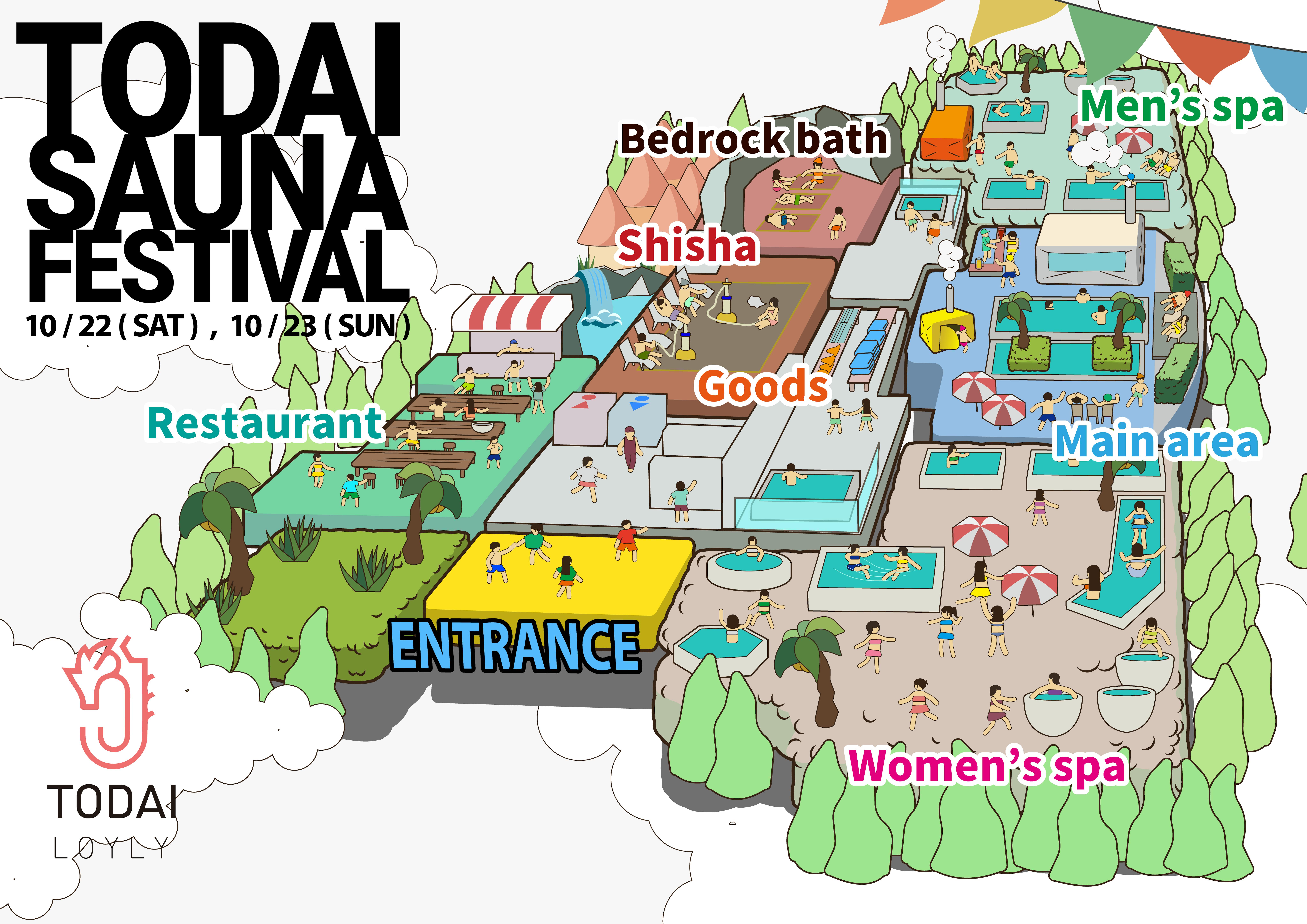 2022/09/27 12:30フェス全体マップが完成!10月22, 23日のフェスに向けて、会場である印西牧の原・アジアンSOLA SPA牧之原モア温泉のマップが完成しました!学生も大人も関係なく、サウナフェスを楽しんでいる様子が分かるようなイラストに仕上がっています!改めて、こんなに大きな会場でサウナフェスを開くことができるのが楽しみです…!これからもどんどんフェスの詳細を公開していきますので、乞うご期待ください!!! もっと見る