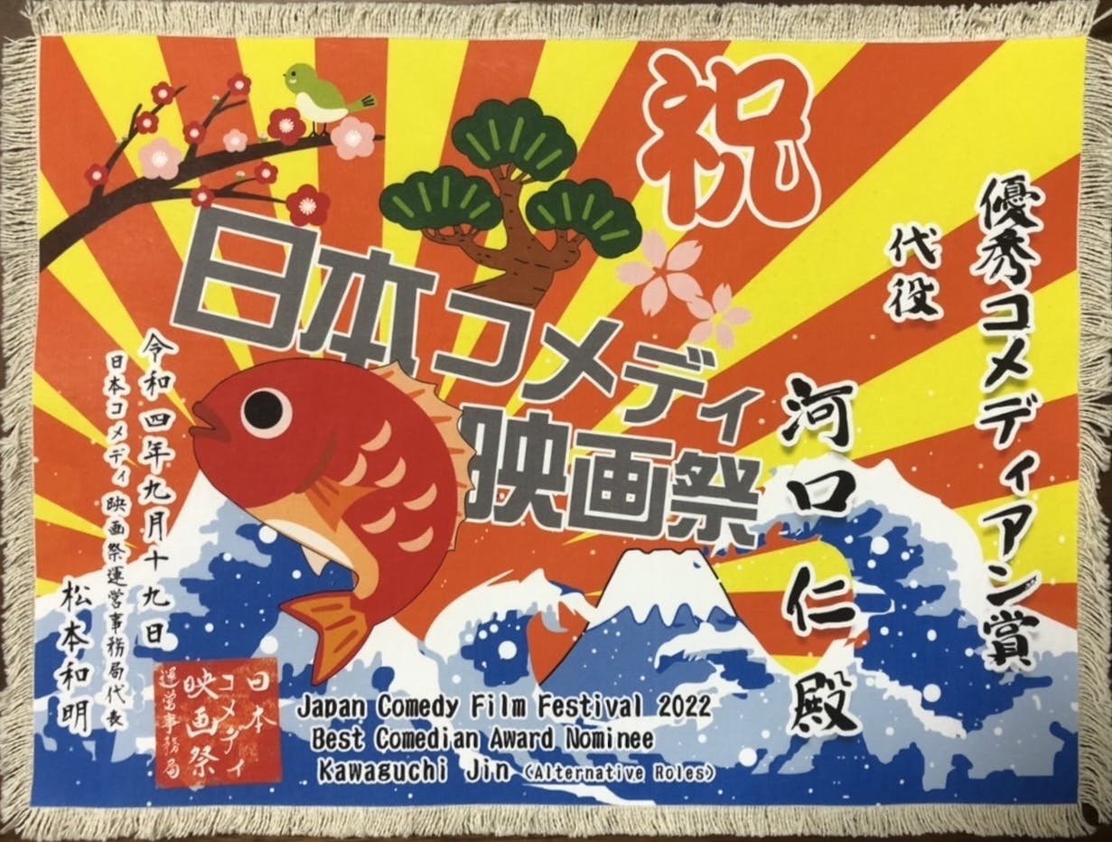 2022/09/21 13:01遠目にはちょっと、小さな布切れのように見えてしまう表彰状ですが受け取られた受賞者の皆さんに、喜んでいただけました!表彰状の画像は、中野劇団さんのTwitterからお借りしました。2018年に作られた作品「代役」で優秀コメディアン賞を受賞された河口仁さんは、2020年にお亡くなりになったのですがそれまで元気に表彰式の司会を務めていたジェイキーが、河口さんのお名前のところで声を詰まらす姿が印象的でした。ゆるキャラが司会を努める映画祭ということで、これ自体が1本の映画になるのでは?というほど、沢山のドラマがありました。初の試みが満載の「日本コメディ映画祭」を見守っていただき、感謝しております。 もっと見る