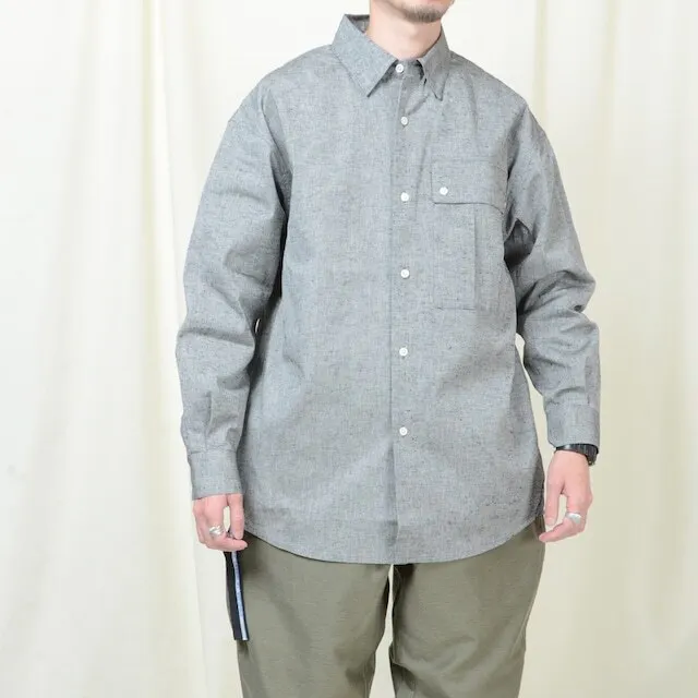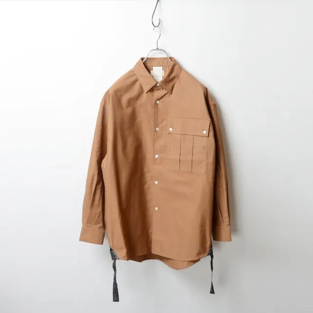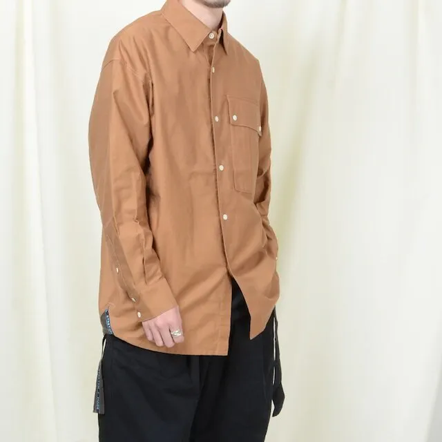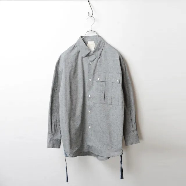 しっかりした厚手の綿を使用したリメイクシャツ。シャツの羽織的な雰囲気で着ることができ、長い期間着られるアイテムです。シルエットはオーバーシルエットになっており、襟部分はボタンダウン仕様。ボリュームのあるビックポケットで胸元に存在感を出しスマートフォンもすっぽり入るデザインです。