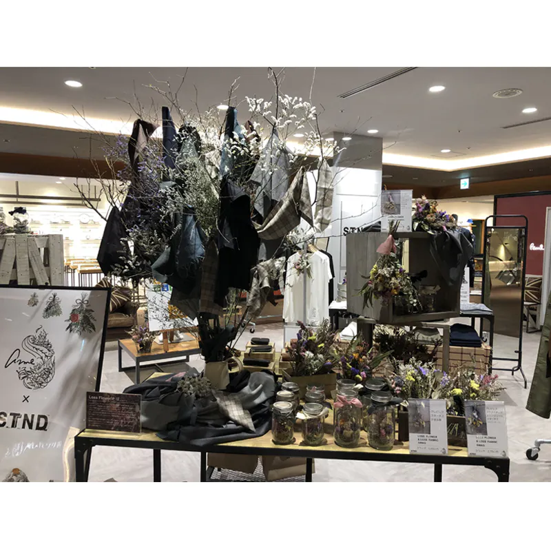イベントなどで使った花をドライフラワーにしたロスフラワー、古着、などと共同でPOPUPのお店を運営し、世界観の演出など他業種とのつながりでアパレルだけでない店の演出も手がけています。