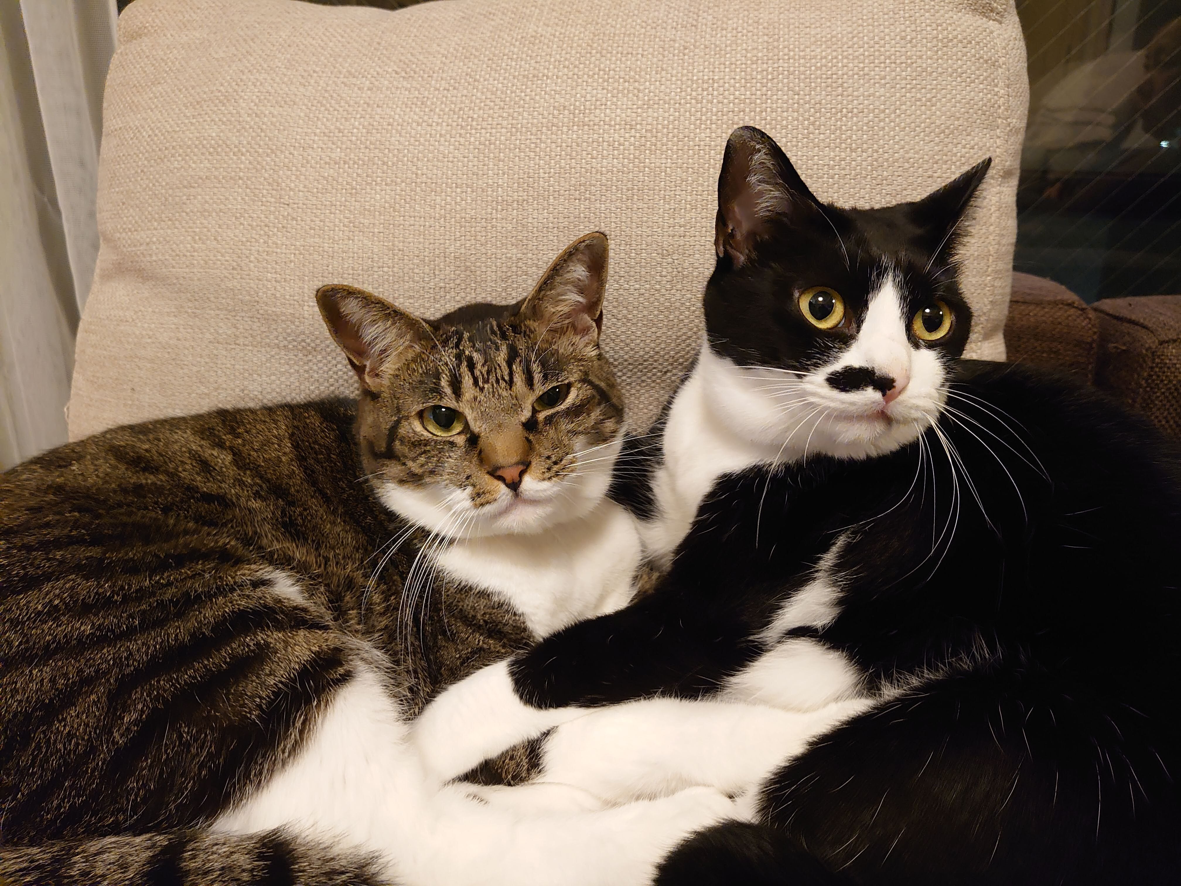 男の子の「タロー」(キジ白)と、女の子の「ハナ」(ハチワレ)。