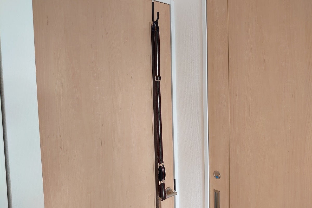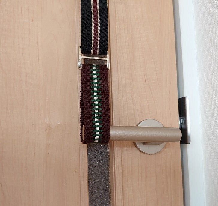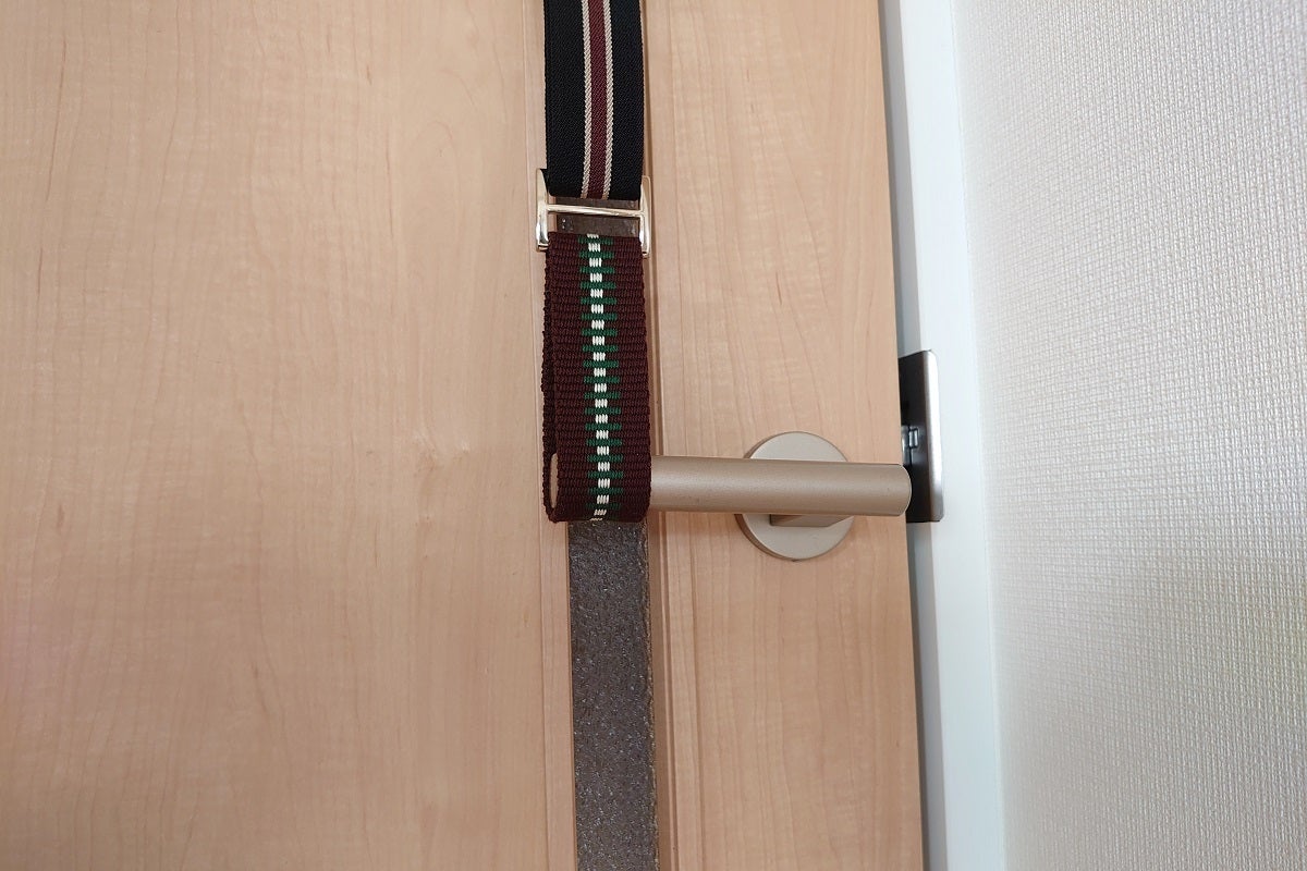 レバー式ドアの上部にフックを付け、ベルトでフックとレバーを固定して使います。