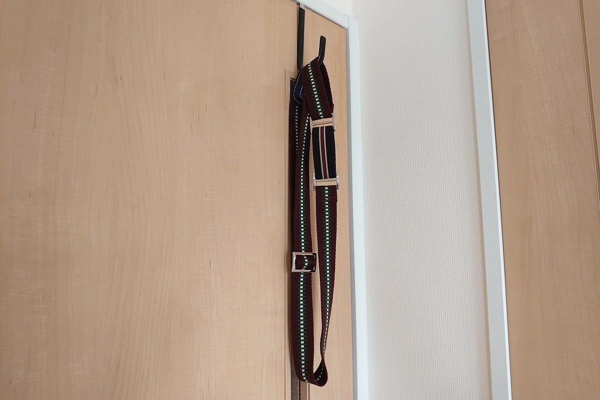 ドアの上部に引っ掛けるドアフック1つと調節可能なベルト(間にゴム素材)1本をセットにした