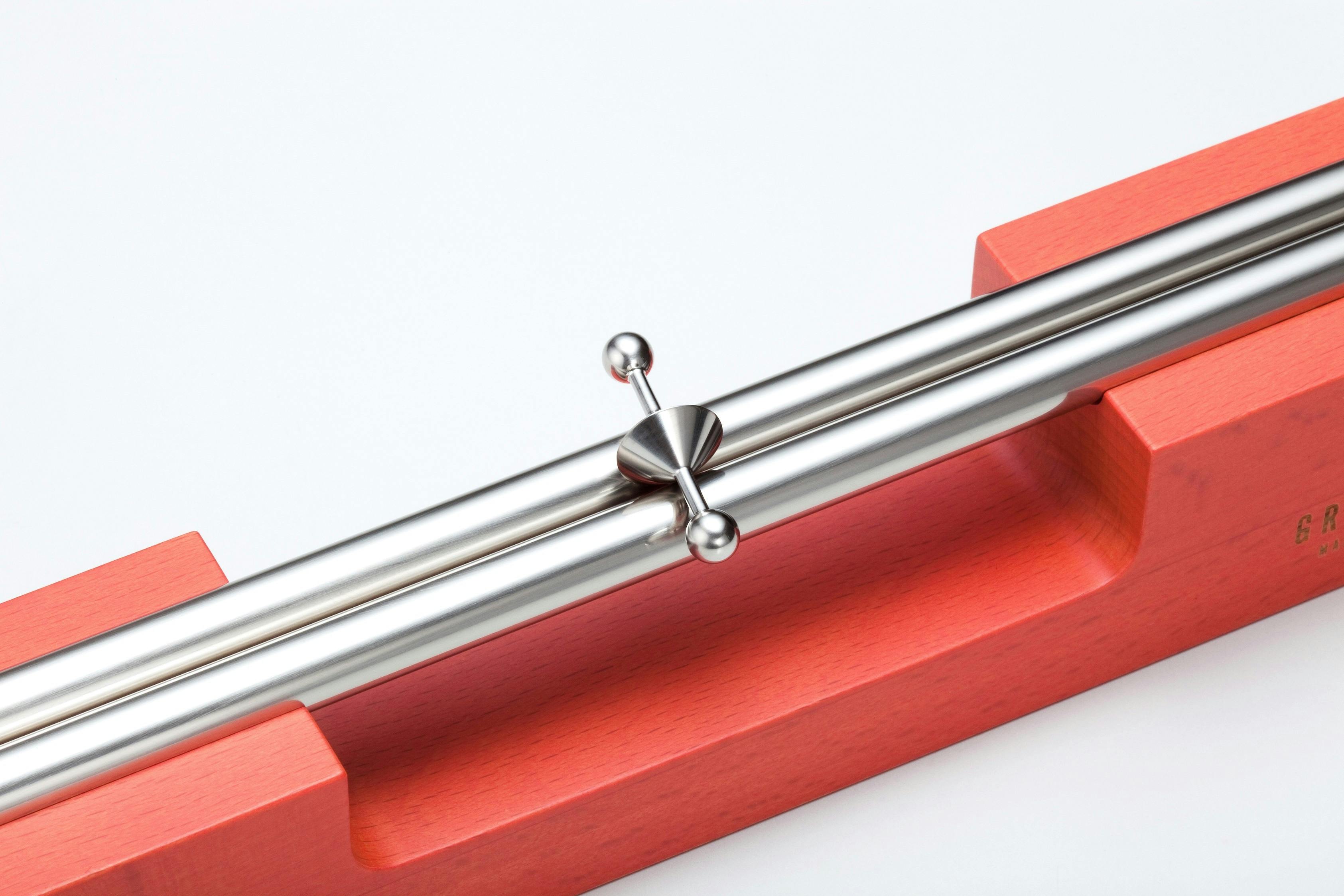 スピンドルは坂道に2枚の壁を作り、その間に紡錘の形をしたモノを転がしたときに生まれた作品。紡錘の形をしたモノが、両側の壁に交互にゆっくりぶつかりながら心地よい音を奏でて下りていきます。