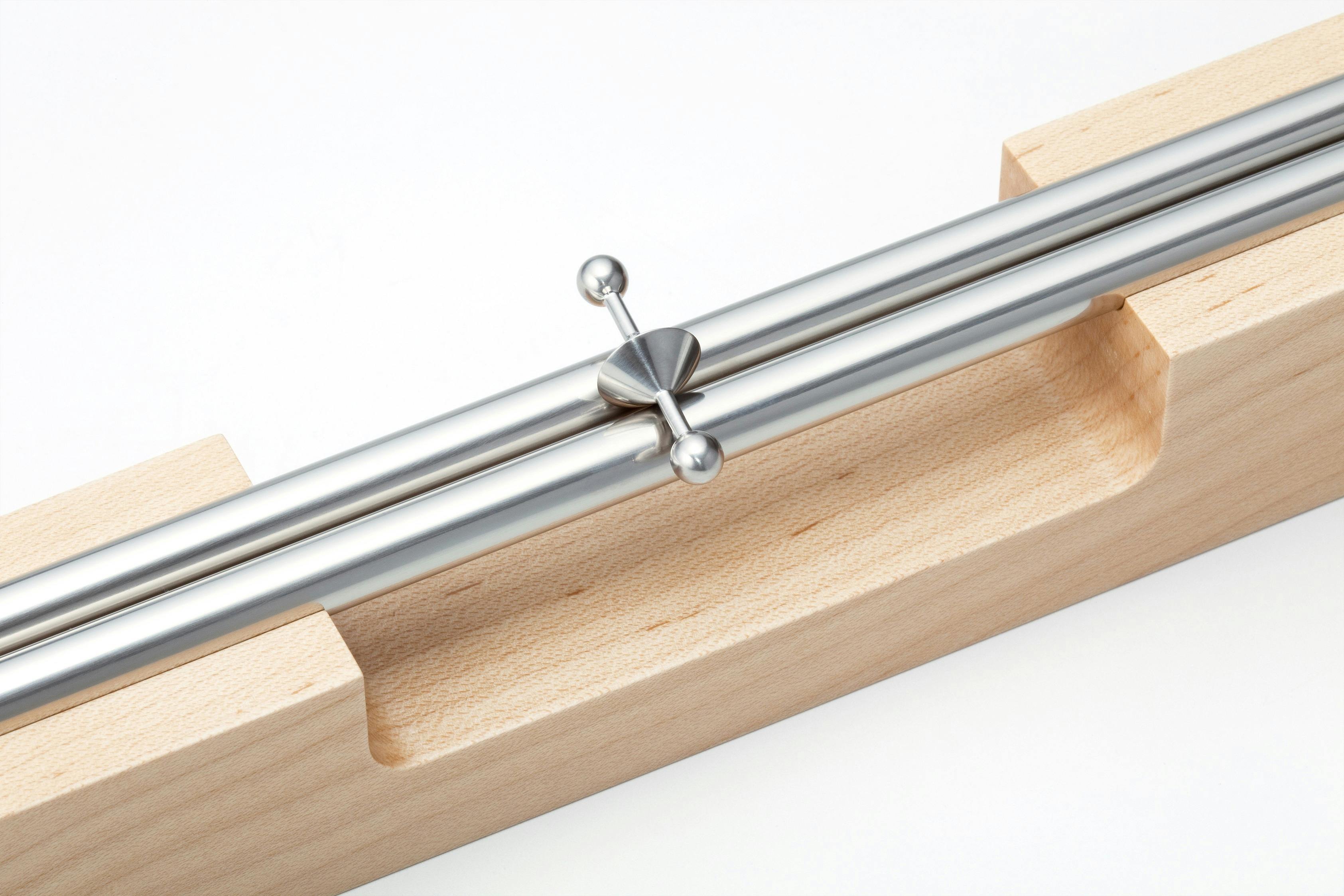 スピンドルは坂道に2枚の壁を作り、その間に紡錘の形をしたモノを転がしたときに生まれた作品。紡錘の形をしたモノが、両側の壁に交互にゆっくりぶつかりながら心地よい音を奏でて下りていきます。