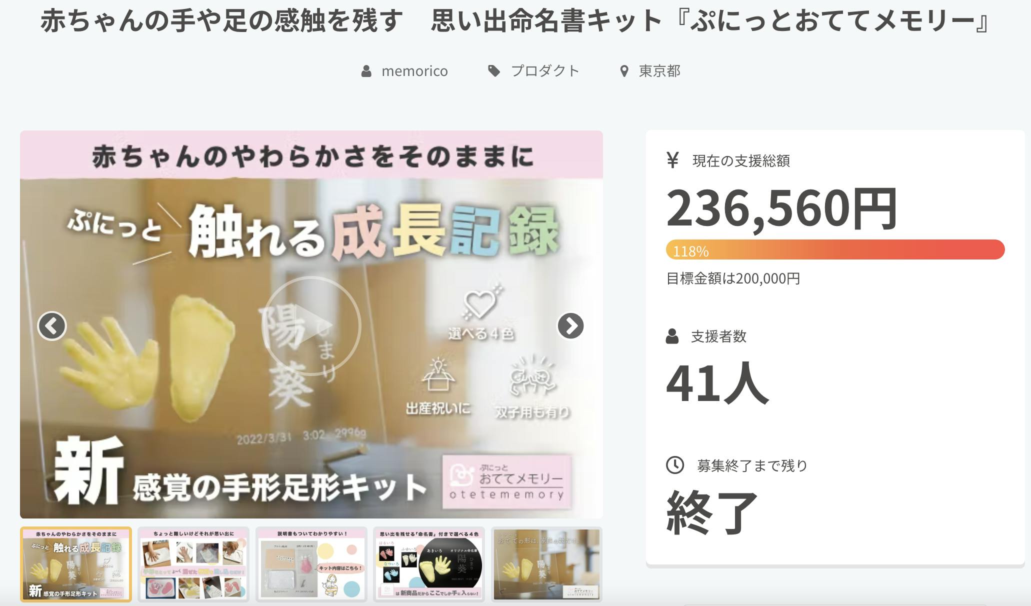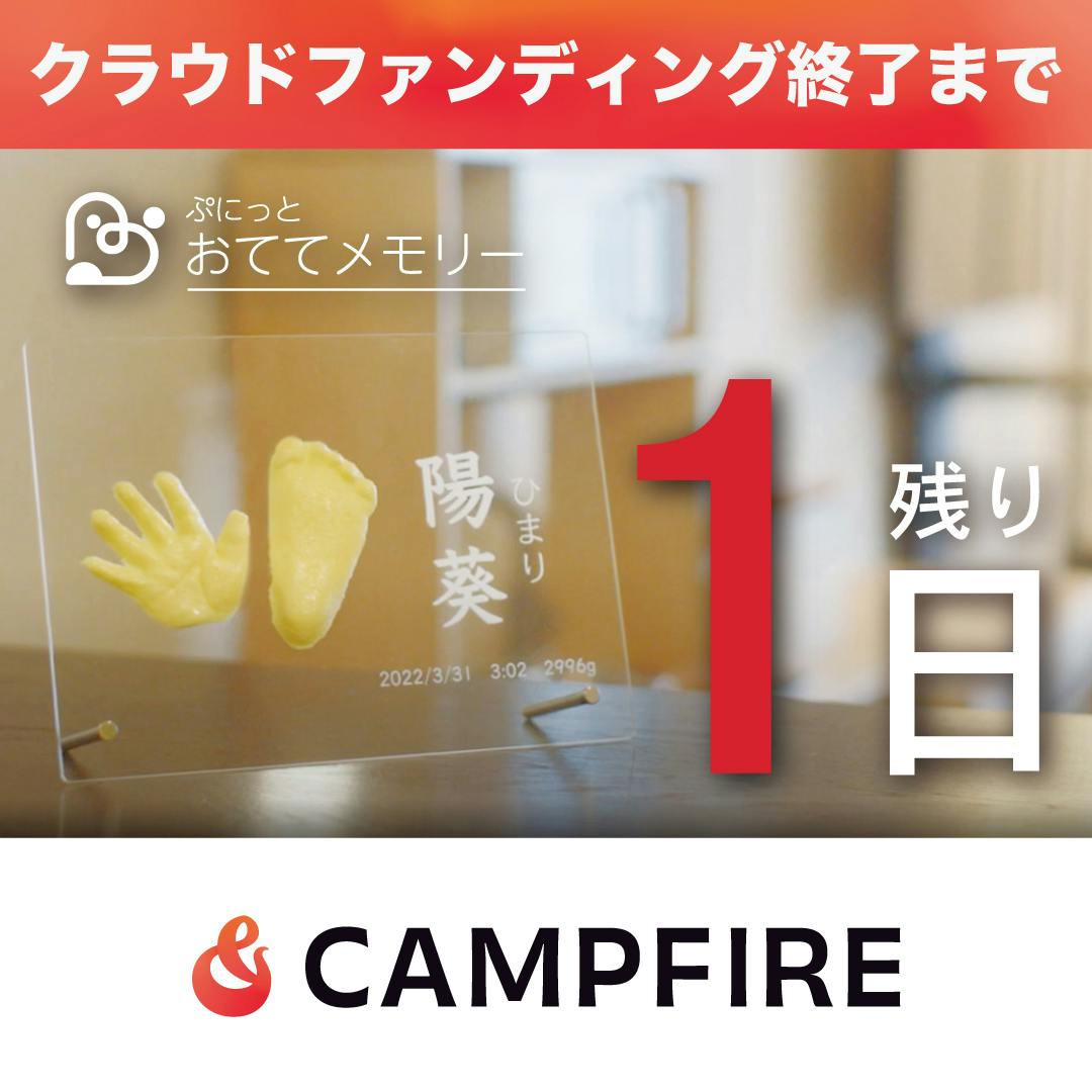 2022/11/29 15:00ご支援者様、こんにちは!ついに明日11月30日23:59でプロジェクトが終了します。当初の目標金額20万円に対して現在、39名から223,580円のご支援をいただき目標を達成することができています!たくさんのご支援ありがとうございます。より多くの方に「赤ちゃんのぷにっとした手足の感触を残してほしい」という思いが私たちスタッフにあり、一般販売を目指してネクストゴールとして50万円の目標を設定しましたが、そちらはまだ達成できていません。残りわずかではありますが、最後まで諦めないのでご声援いただけると幸いです。 もっと見る
