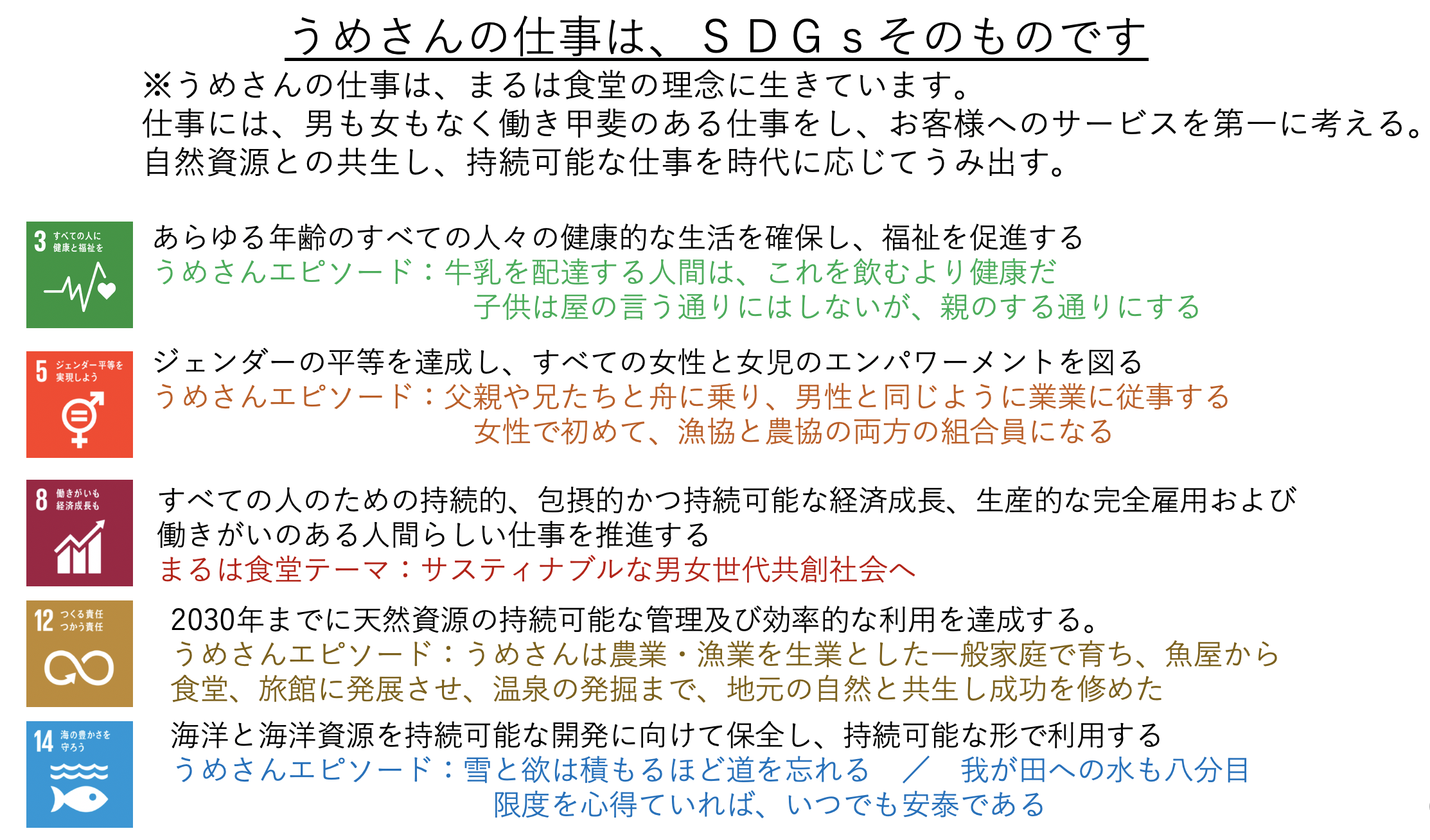 うめさんの仕事の仕方は、まさにSDGsそのもので、お客様へのサービスを第一に考え、持続可能な仕事を、その時代に応じて生みだしてきたことを、この舞台を通して皆様にお伝えしたいと考えています。