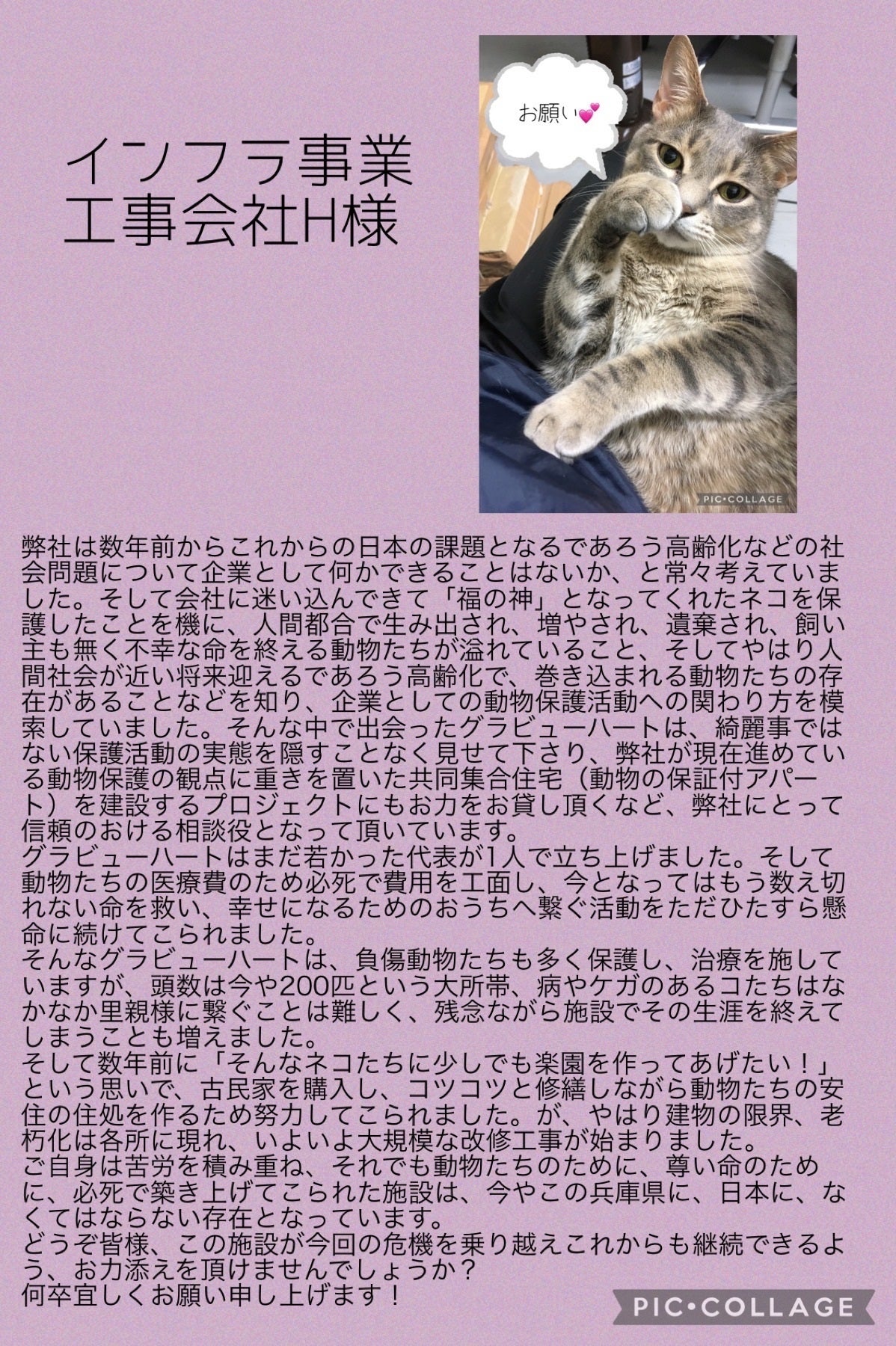 2022/11/24 21:29こんにちは、クラウドファンディングを担当致しましたゆずです。一昨日の晩から昨日の朝にかけて、メールアドレスのわかる方へサンクスメールを送信させていただきました。そして、返礼品のほうは週明けに発送予定です!!今回、172人の方がクラウドファンディングにご支援くださいました!!(現金やふりKの方を含めると200人近く!)ご支援くださった気持ちがとてもとてもうれしいです!!お礼状は、一枚ずつ感謝を込めて書かせていただきました。(字がそんなに上手い方でも味があるわけでもないのに手書きですみません)「何県の何様がご支援してくれはったんやなぁ」「あ!シッターのお客様や!ありがたい!!」「この方、何回も支援してくださってる!」などなど一人一人お名前を見ながら、送付作業も致しました。ステッカーやシールの出来は、かなりいいものだと自負しております(ドヤァ)それもこれも、いろんな方のご協力があってこそでございます。ありがとうございます!!ホントに助かりました!!!!そして、ご支援者様の中よりブログ掲載の許可をいただいた方のお名前をこちらでご紹介していきたいと思います!!まずはお店の売り上げを寄付してくださったり、チラシをお店に貼ってくださり何よりスタッフの心のよりどころになってくださっているLight Blueさん(https://goo.gl/maps/PRSzwPMfX2uwqvC87)姫路市の土山、ツカザキ記念病院からすぐ近くで9~18時で営業(木曜休み)モーニングやランチを展開してらっしゃり、お菓子はテイクアウトも可能!みなさんご存じのT軍団のホームレスキャットさんはブログで寄付を募ってくださり、まとめてご支援くださいました。ホームレスキャットご支援者様(T.Nakagawa様N.Nakamura様)現在もホームレスキャット引き継いだ元支援者の方が、現地の人やボランティアさんをまとめて、海辺の子達のえさやりを継続されています!!絵本作家であり、福祉施設で郷原氏&ゆずに認知症講義をしてくださったうえのみえこ様(https://qr.paps.jp/fJVdk)←絵本のURLこの絵本は、認知症の介護をしてらっしゃる方やこれからのことを家族で理解し合うためにも、オススメの絵本です。私と郷原さんも読ませていただきましたが、講義の内容がわかりやすく集約されているのがこの絵本になります。以下個人のお名前のため、お名前の掲載だけさせていただきます。≪Special Thanks≫西馬弘治 様入江雅代 様たけだもなか 様斎藤パーキンス海 様 来田義行 様松本眞希子 様みーこ 様なおこ 様あずきの母 様みーちゃん 様ハゲちゃびん 様Hiroko Wakabayashi 様中西工業株式会社 様菊池玲我 様 菊池美穂 様 jagbase 様ひろたけ 様PちゃんQちゃん 様多美論ママ様 めぐちゃん様沢山の皆様、本当に本当にありがとうございました!!!!こちらのお名前の施設展示は年明けを予定しております。またブログでご報告いたしますね。600万という高額な目標金額だったため、目標達成とまではいかず申し訳ありませんでした、私の力不足です。しかし172人のおひとりおひとりのお力が、改装費用に充てられて無事工事が完了いたしました。新たに、施設に足を運んでくださる方には以前より臭いがしなくなった、カフェスペースが併設されていて過ごしやすいトイレが見えなくなったのがいい、プレイルームが広くなった などなどお褒めの言葉を頂戴しております(ニヤニヤ)そんな新しいグラビューハートのご見学や里親様のお見合いは随時行っております!!!https://fuu-cafe.grabeau-heart.group/こちらの営業カレンダーを来る直前にもう一度確認してから来てください!!フードやカフェをご利用の方は、事前にラインか電話をくださると、非常にありがたいです(。-人-。)気になる猫がいるから来るでも、保護猫を飼ってみたいでも里親になる理由は、人それぞれですので、ドライブ感覚で気軽にお越しください。駐車場が、表から裏の畑に変わっておりますのでご注意ください。※※裏の駐車場は畑なので車高の低い車は、ご注意ください※※バイク好きの猫好きさんも多いかと思いますので、バイク乗りさんは、表の母屋前のコンクリートのスペースへどうぞ!!ツーリングがてら、猫と戯れて、お茶して帰ってくださいませ♥以上、長くなりましたがクラウドファンディングのお礼ブログでした!!本当に、皆さまの貴重なご支援ありがとうございました!!! もっと見る