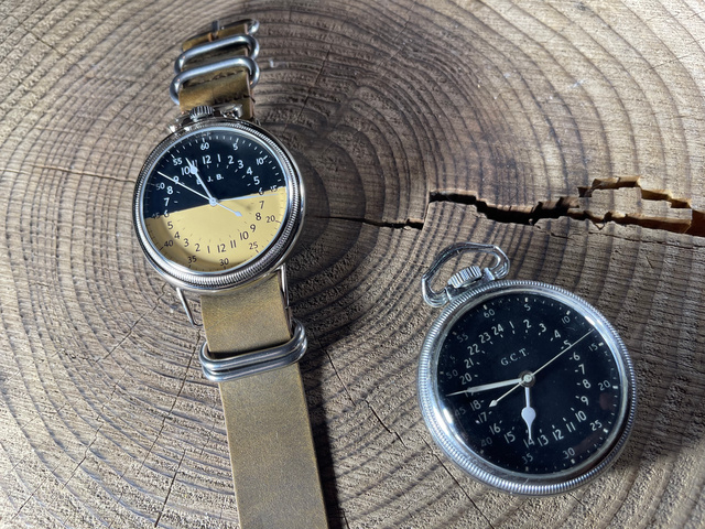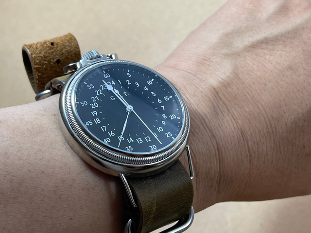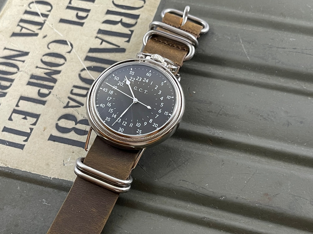 時字は内側に1-24時間表記になっていて外側に秒字が5秒刻みで記されています。スイス・ロンダ社のムーブメントを使用しています。文字版に記されているG.C.Tは(Greenwich Civil Timeグリニッジ標準時の略).。大きな文字版なので24時間時計でも時間が読みやすいです。