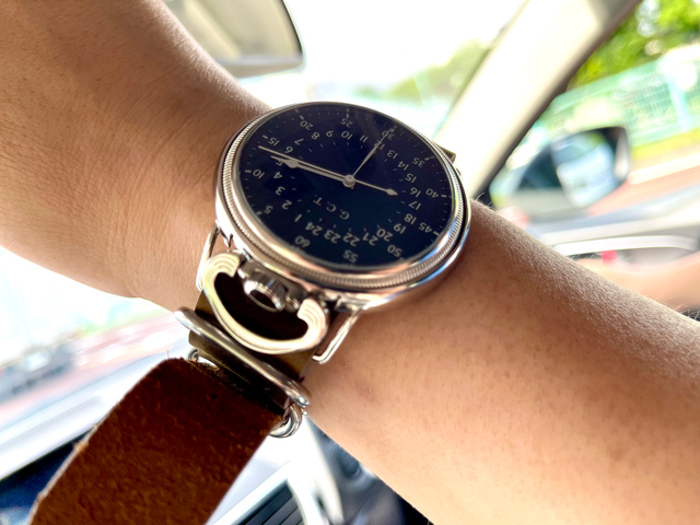 腕時計に使いやすいようにリサイズ(直径を約5mm減の46mm)しています。また電池式のクォーツ時計として復刻しています。大きな文字盤なので24時間時計でも時間が読みやすいです。