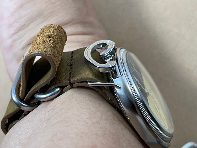現代に於いても、ポケットウォッチを革のカバーに包み腕時計にするものはあります。どうしても大きくてゴツくなってしまいます。カバーが懐中時計のフォルムを隠してしまい本来の懐中時計のシェイプや雰囲気が損なわれてしまいます。