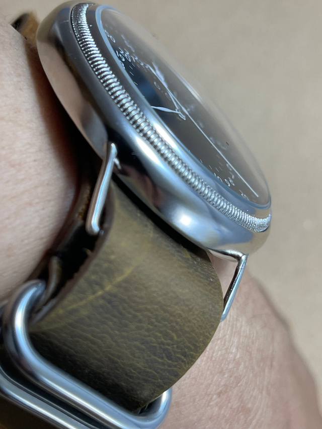 コインエッジも隠す事なく収まる腕時計カバー、細いラグが時計そのものを引き立てています。