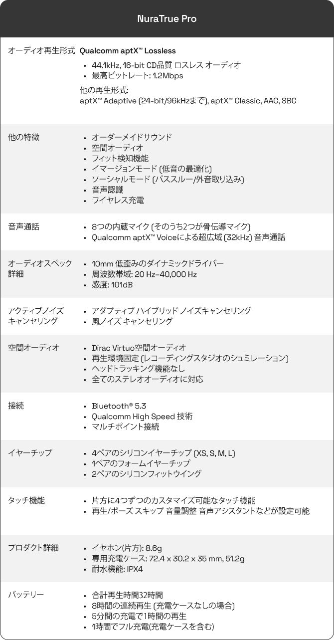 また、NuraTrue Proは、880Kbps(ロスレスの約80%の音質)の24ビット/96kHz lossy audioをサポートするなど、Qualcomm aptX™ Adaptive/Classicの以前のバージョンなどの下位音質への互換性も持っています。
