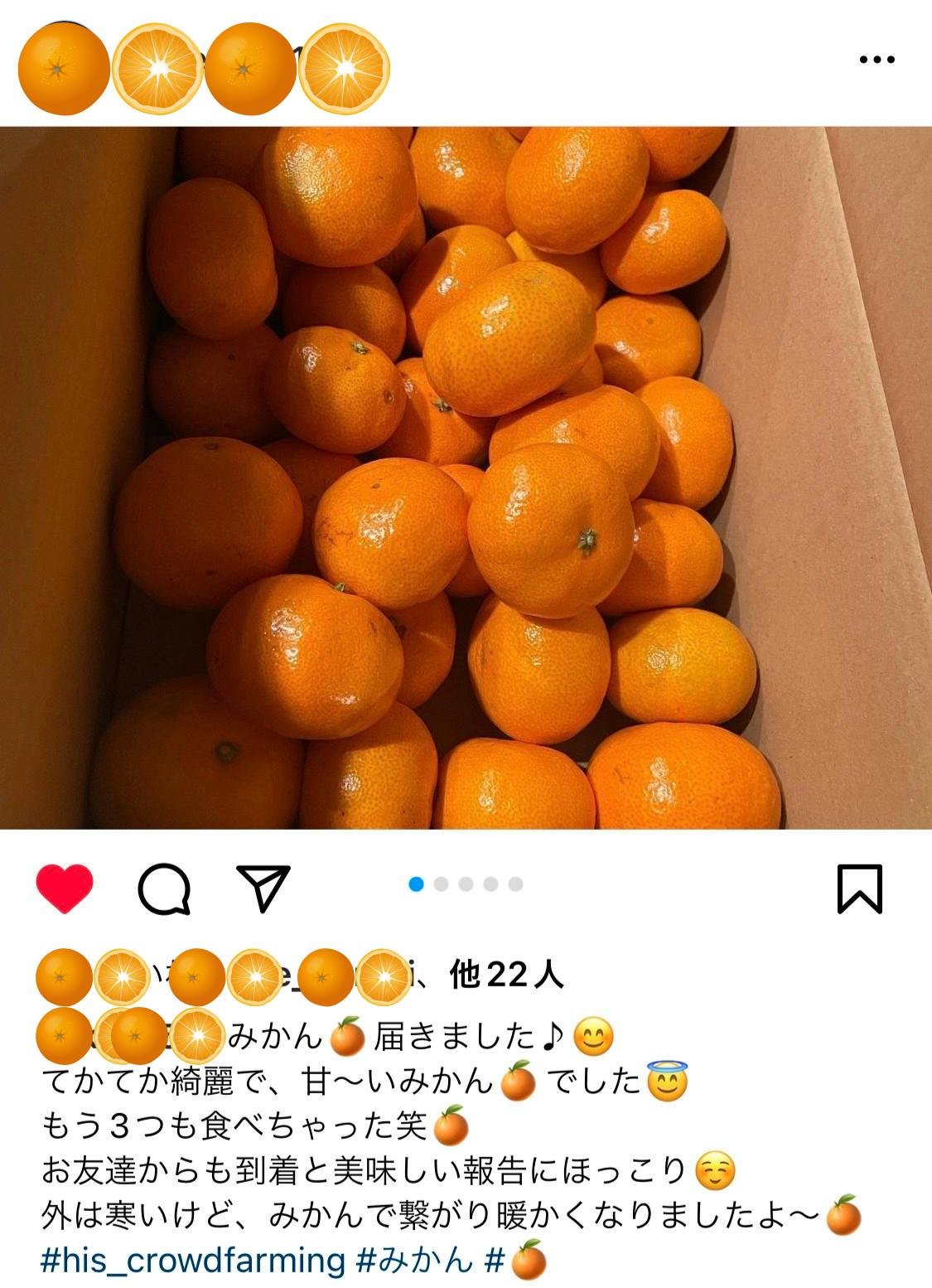 • 第4回 御浜町みかん成長レポート生産者の西さんより、収穫直前の11月末のみかんの様子が届きました。西さんから収穫直前のみかんの写真をいただきました。さらにみかん色が濃くなって輝いています。いよいよみかんの採果がスタートしました!皆様への発送は12月5日、6日頃を予定しています。みかんが届きましたらぜひ、感想や西さんへのメッセージなどをSNSなどでシェアしてください^^#his_crowdfarming のタグ付けもお待ちしております♪これから収穫したみかんを搾汁しジュースにしていきますので、ジュースをお申込みいただいた方へは1月の発送予定となります。もうしばらくお待ちくださいませ。 もっと見る