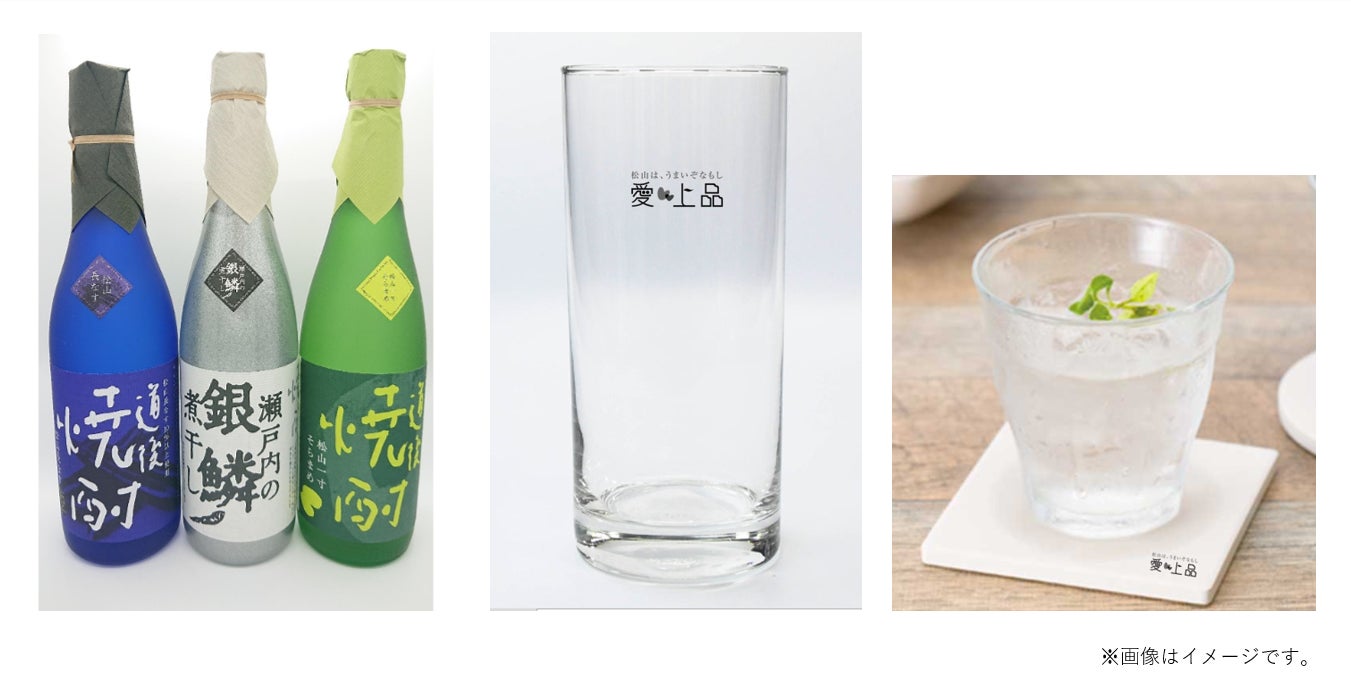 飲み比べには、原料に「松山長なす」を使った珍しい焼酎。「松山一寸そらまめ」を使った焼酎。「瀬戸内の銀鱗煮干し」を使った焼酎の3本をご用意しました。「松山長なす」は、肉質はやわらかく、きめが細かく種はほとんどありません。みずみずしく甘みがあるのも特長です。松山周辺でしかつくられていない特別な一品です。「松山一寸そらまめ」は豊かな香りが自慢。そんな松山一寸そらまめを贅沢に使い、初夏を思わせるすっきりとした飲み口に仕上げました。「瀬戸内の銀鱗煮干し」の焼酎は、味わいのある飲み口に仕上げ、銀色に輝く煮干しをイメージした特製のボトルに詰めました。ぜひ飲み比べを通して上質で暖かな愛媛・松山をご堪能ください。また、本コースのノベルティーには「愛 上品」グラスと「愛 上品」珪藻土コースターをご用意。コースターは珪藻土でできているため、グラスの水滴を吸収。透明度の高いグラスに道後焼酎を注ぎ、お好きな割り方でぜひお楽しみください。